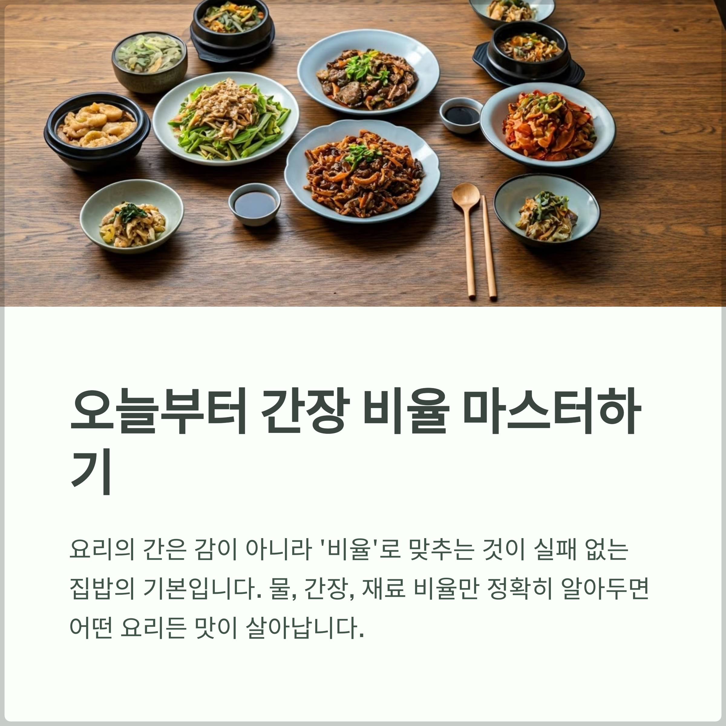 요리의 간은 감이 아니라 ‘비율’로 맞추는 것이 실패 없는 집밥의 기본입니다. 물, 간장, 재료 비율만 정확히 알아두면 어떤 요리든 맛이 살아납니다. 간장 하나만으로도 요리의 기본 간을 만들 수 있다는 점, 오늘부터 실전에서 직접 적용해 보세요!