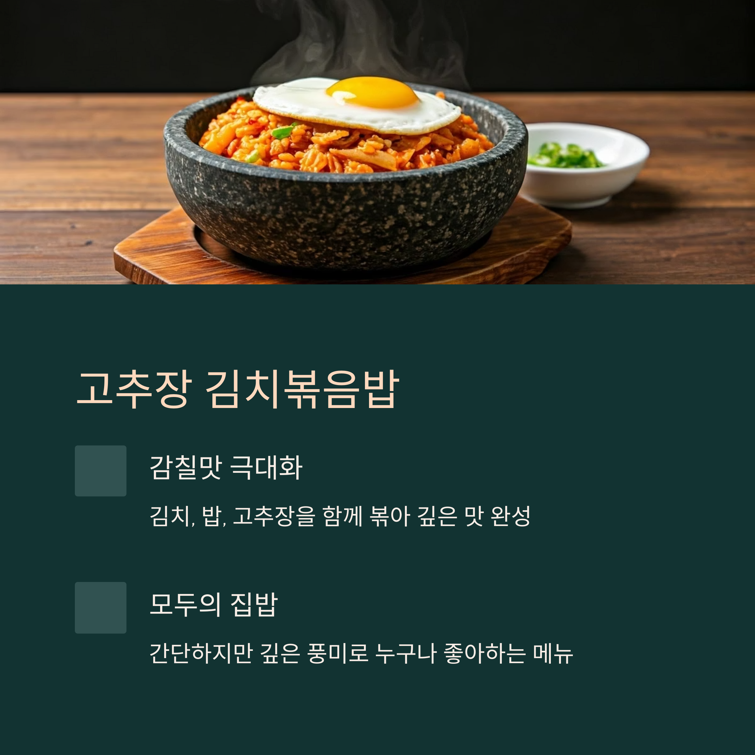 김치볶음밥에 고추장을 한 스푼 더하면, 감칠맛과 풍미가 한층 살아납니다. 잘 익은 김치와 밥을 볶을 때 고추장과 설탕, 간장 약간을 더해주면 깊고 진한 맛이 완성되고, 베이컨이나 참치, 소시지를 추가하면 더 든든한 한 끼로 즐길 수 있습니다. 마지막에 달걀 프라이와 김가루, 깨소금으로 마무리하면 완성도 높은 집밥이 됩니다. 남은 밥, 남은 김치만 있어도 뚝딱 만들 수 있는 국민 반찬형 한 그릇 요리입니다.