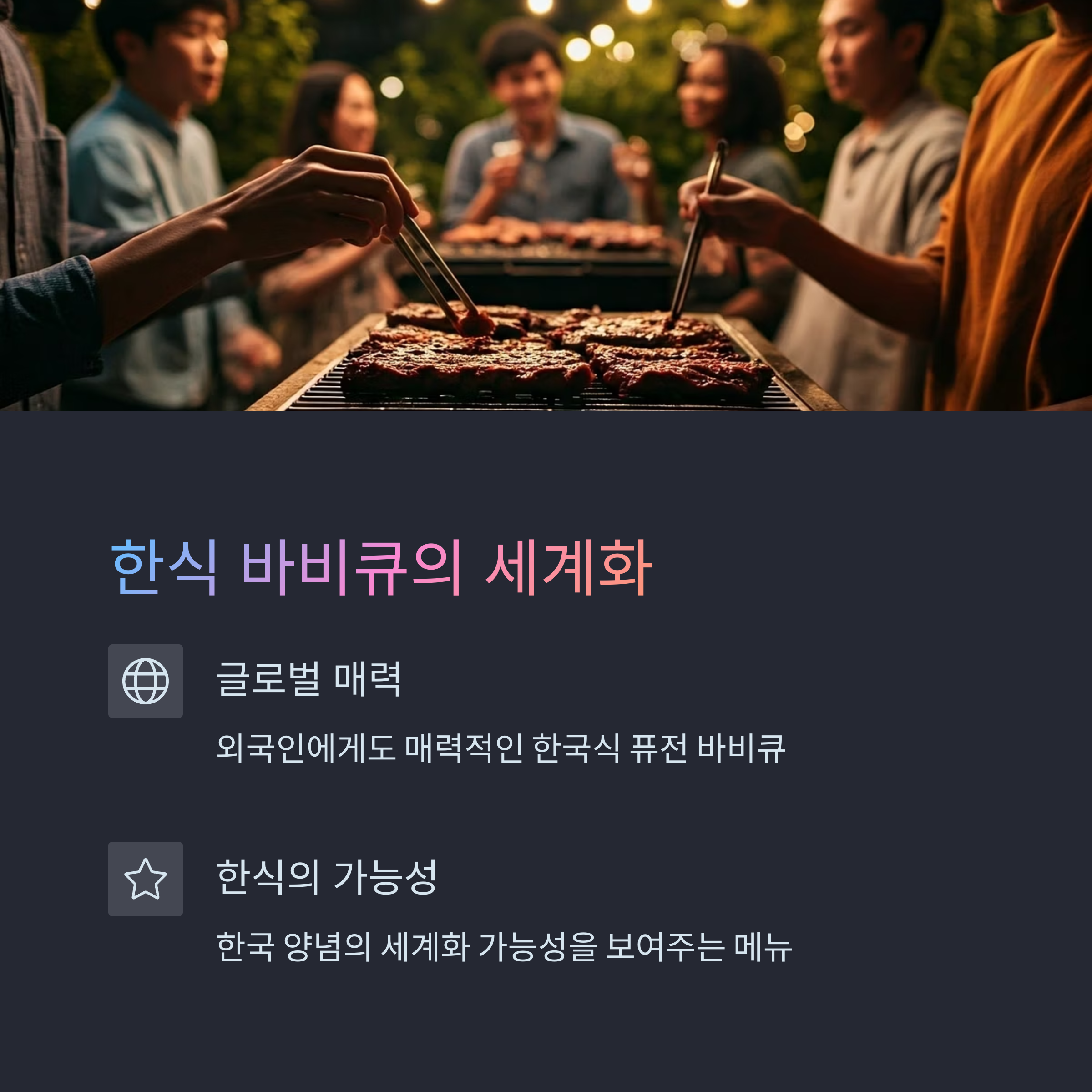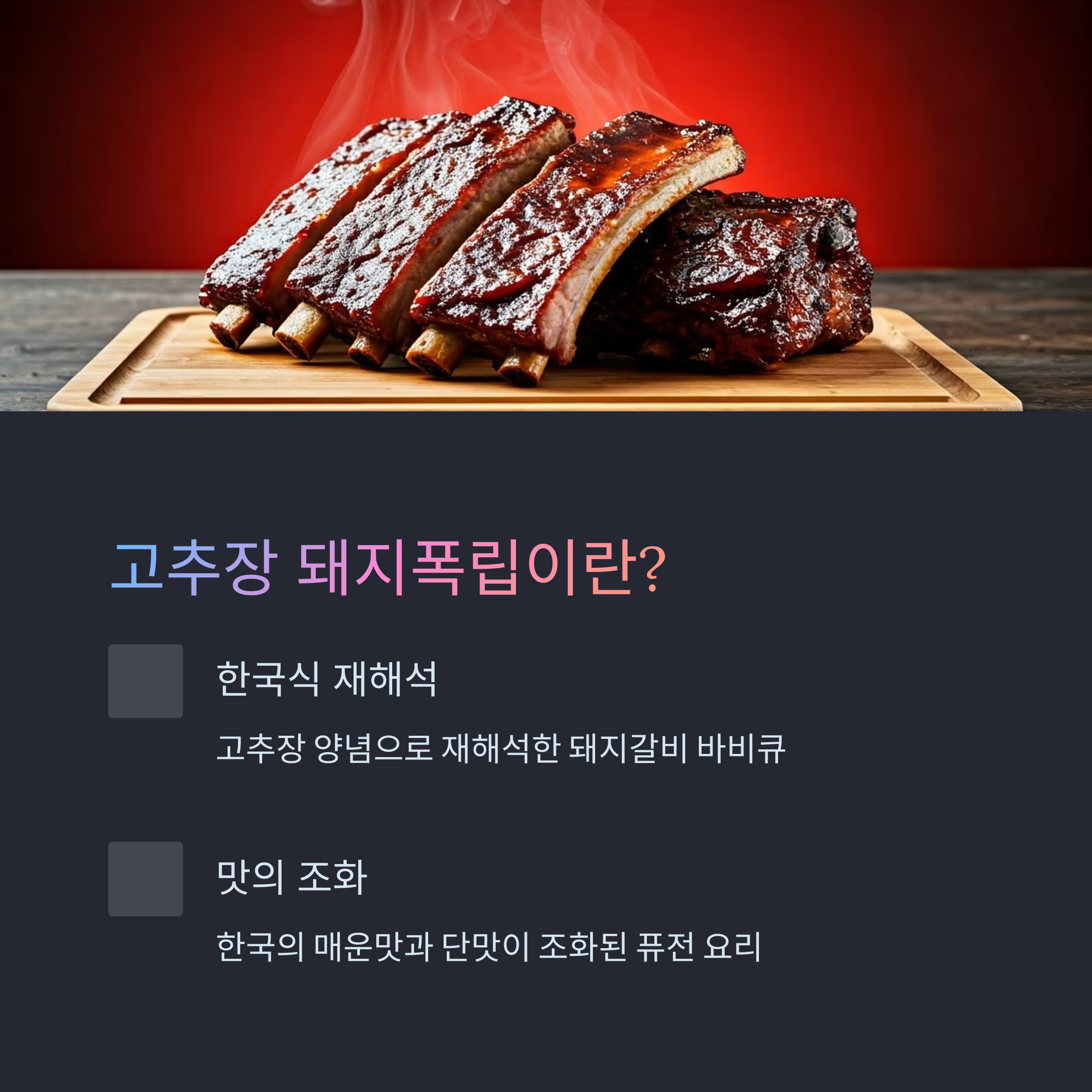 고추장 돼지폭립은 단순한 바비큐 메뉴가 아닙니다. 그것은 한식의 맛과 바비큐 문화를 결합한 대표적인 퓨전 요리로서의 가치를 지닙니다. 외식 문화가 다양화되고 있는 오늘날, 고추장 폭립은 외국인에게도 매력적인 한식 경험이 될 수 있으며, 한국인에게는 익숙한 맛을 새로운 방식으로 즐길 수 있는 기회를 제공합니다. 특히 전통적인 양념 갈비보다 더 강렬한 풍미와 직화 향을 살릴 수 있어, 고기 마니아들에게도 만족감을 줍니다. 조리법은 서양식 바비큐에서 착안했지만, 그 본질은 한국적인 맛에 있습니다. 이는 한국식 양념의 세계화 가능성을 보여주는 동시에 한식의 새로운 미래를 열어가는 요리라 할 수 있습니다.