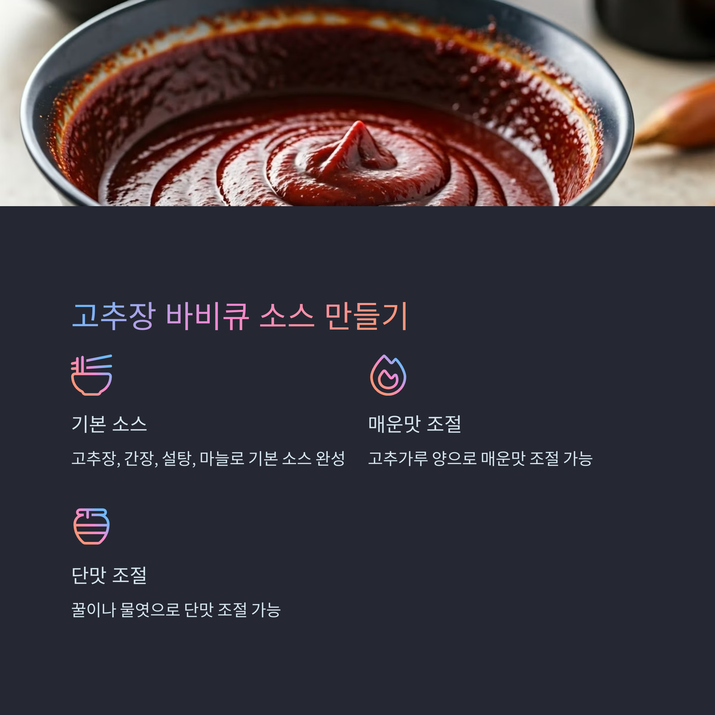 고추장 돼지폭립의 풍미를 좌우하는 핵심은 바로 직접 만든 고추장 바비큐 소스입니다. 기본 재료는 고추장 3큰술, 간장 2큰술, 설탕 1큰술, 올리고당 1큰술, 다진 마늘 1큰술, 생강즙 약간, 참기름 약간, 후추 소량입니다. 이 모든 재료를 한데 넣고 약불에서 5분간 끓이면 맛이 잘 어우러진 깊은 풍미의 소스가 완성됩니다. 더 매콤한 맛을 원할 경우 청양고추나 고춧가루를 추가할 수 있고, 달콤함을 강조하고 싶다면 꿀이나 파인애플즙을 소량 넣는 것도 좋습니다. 이 소스는 갈비뿐만 아니라 삼겹살, 닭날개, 채소구이에도 응용 가능하여 한식 바비큐의 다재다능한 베이스 소스로 활용됩니다.