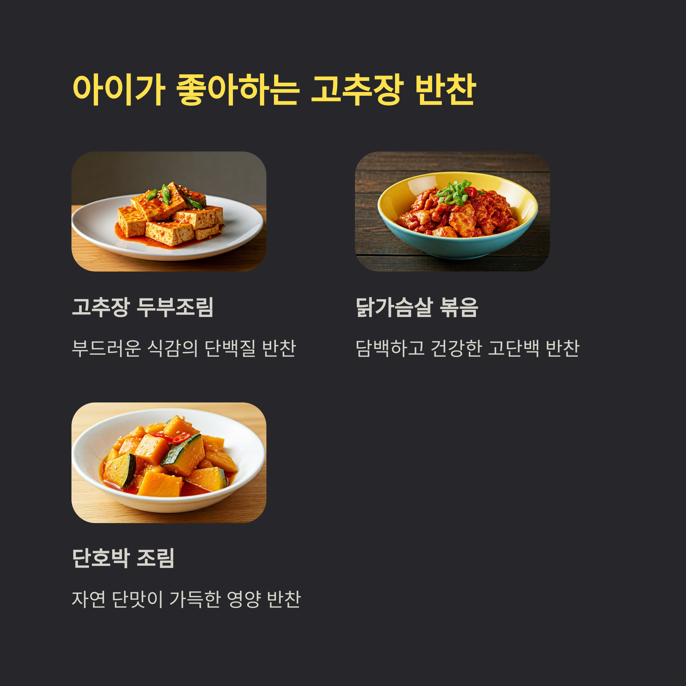 고추장 소스를 응용해 아이용으로 만들 수 있는 반찬은 생각보다 많습니다. 대표적으로 순한 고추장 두부조림이 있습니다. 팬에 두부를 살짝 굽고, 앞서 만든 순한 고추장 소스를 넣고 약불에서 조려주면 부드럽고 짭조름한 맛의 단백질 반찬이 완성됩니다. 닭안심이나 다진 닭가슴살을 사용해 만든 고추장 닭볶음은 밥과 잘 어울리는 단짠 반찬입니다. 또한 고구마나 단호박을 익힌 후 소스를 살짝 끼얹으면 간식처럼 먹을 수 있는 달콤한 반찬으로도 변신할 수 있습니다. 채소도 볶거나 데쳐서 소스를 살짝 곁들이면 편식 방지에 효과적입니다.