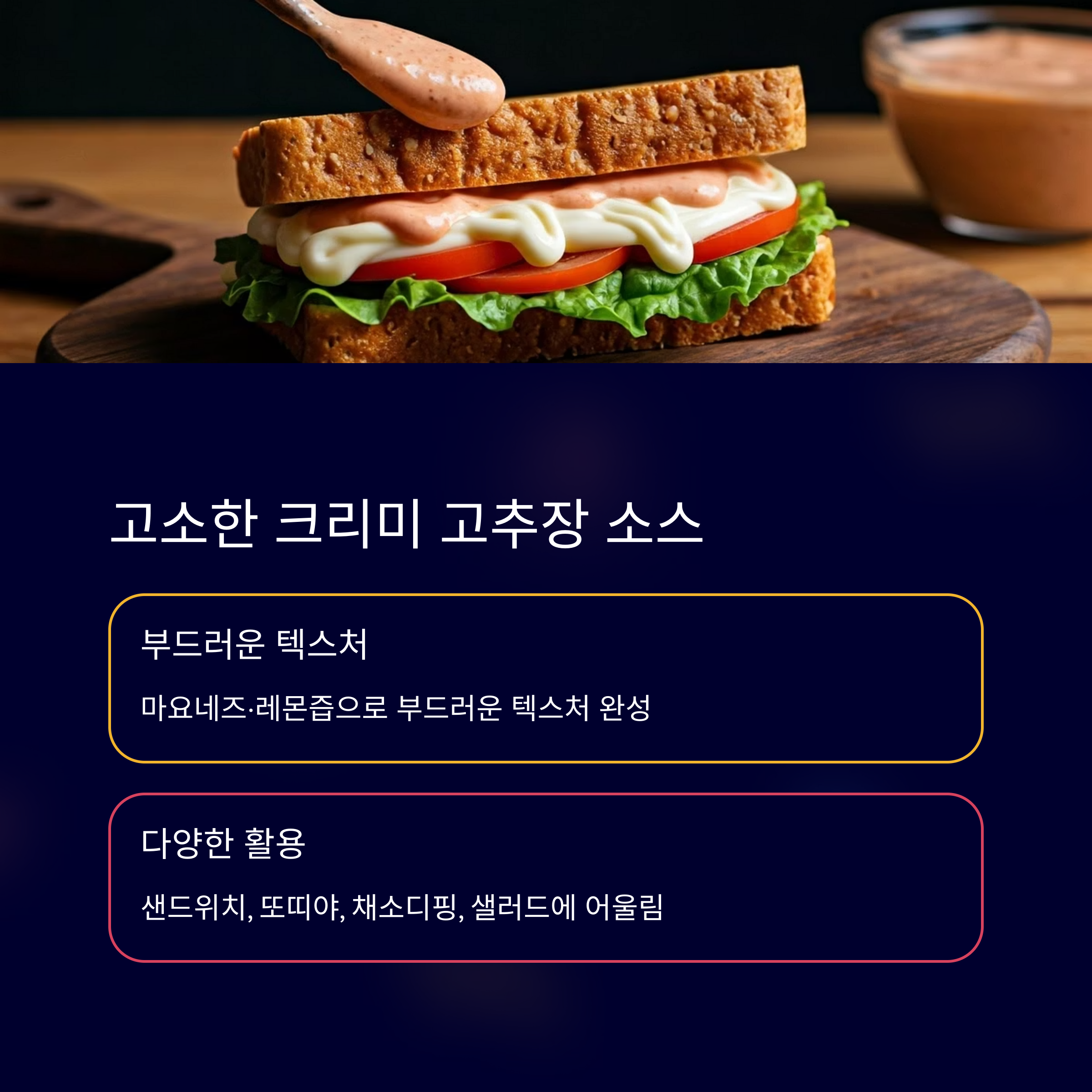 고추장의 풍미를 살리면서도 자극적인 매운맛은 줄이고 싶은 분들께 추천하는 것이 바로 크리미 고추장 소스입니다. 이 소스는 특히 샌드위치, 랩, 샐러드, 구운 고기나 생선 등에 잘 어울리는 고소한 스타일입니다.