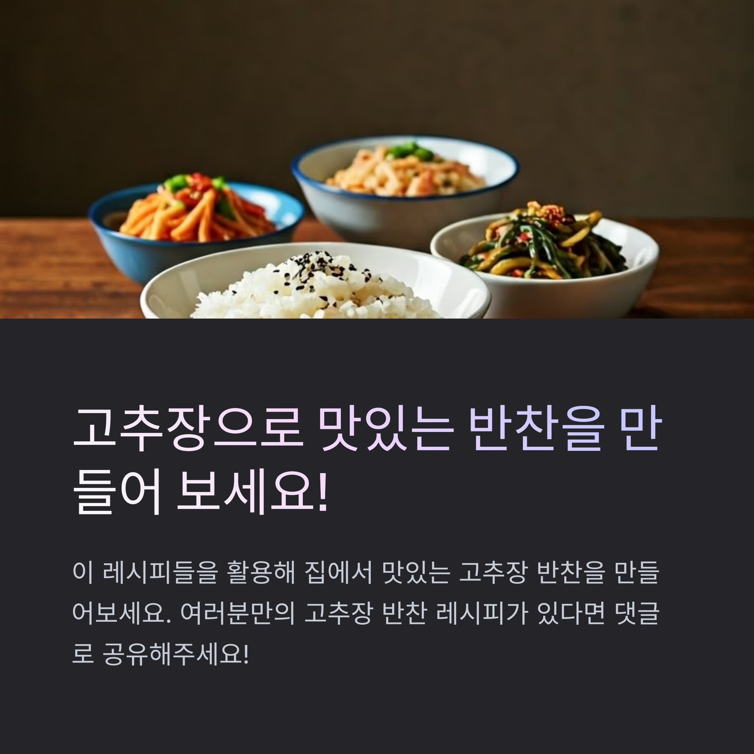 고추장은 양념용뿐만 아니라 다양한 반찬 소스로도 활용 가능합니다. 매콤하고 감칠맛 넘치는 고추장 소스를 재료에 따라 다르게 응용하면, 바로 식탁에 올릴 수 있는 집밥 반찬 베스트 5가 완성됩니다. 오늘은 흔하지 않은 조합으로 구성된, 특별하면서도 일상적인 고추장 반찬 레시피들을 소개합니다. 앞서 소개된 메뉴들과 겹치지 않도록 신선한 재료와 새로운 조리법으로 구성했어요.