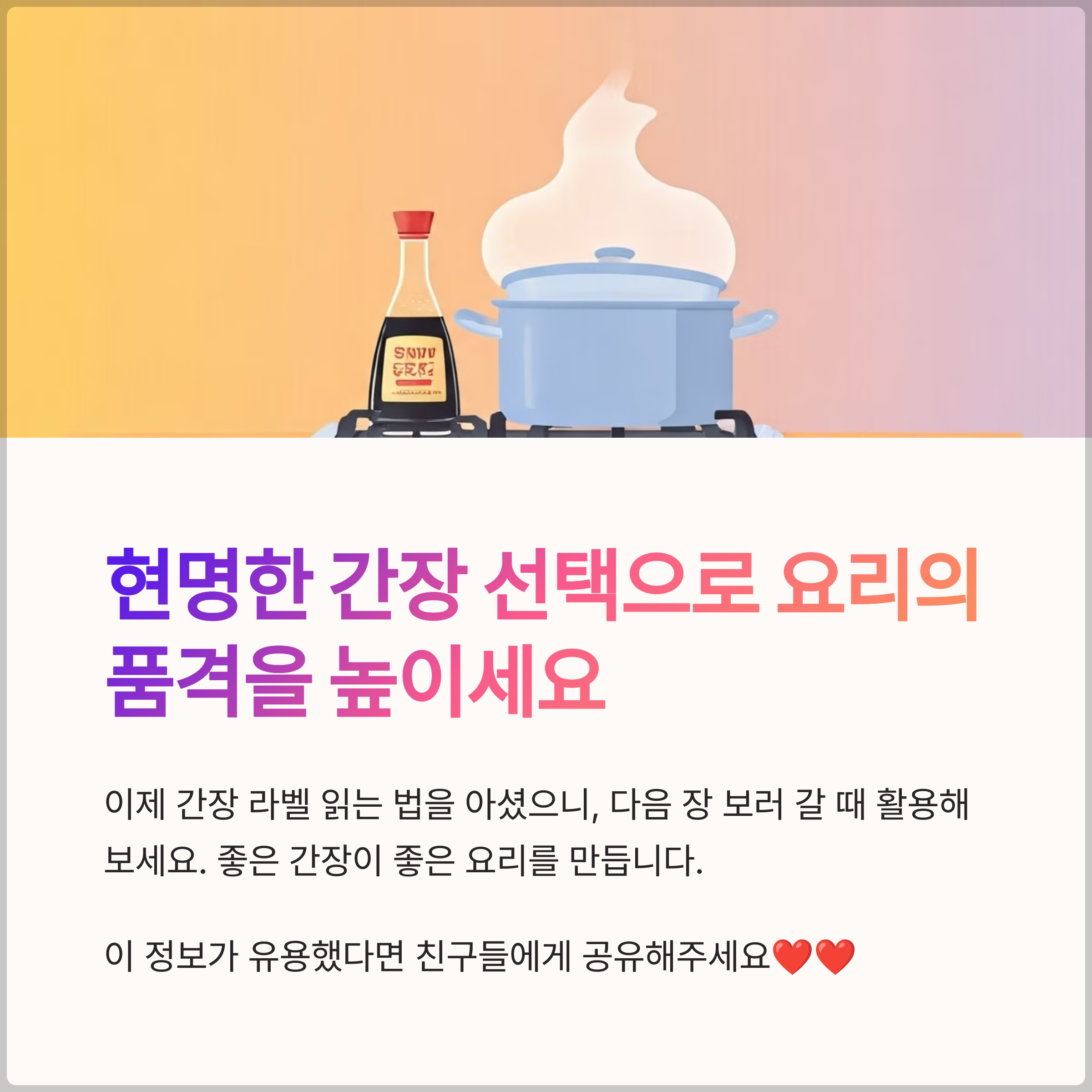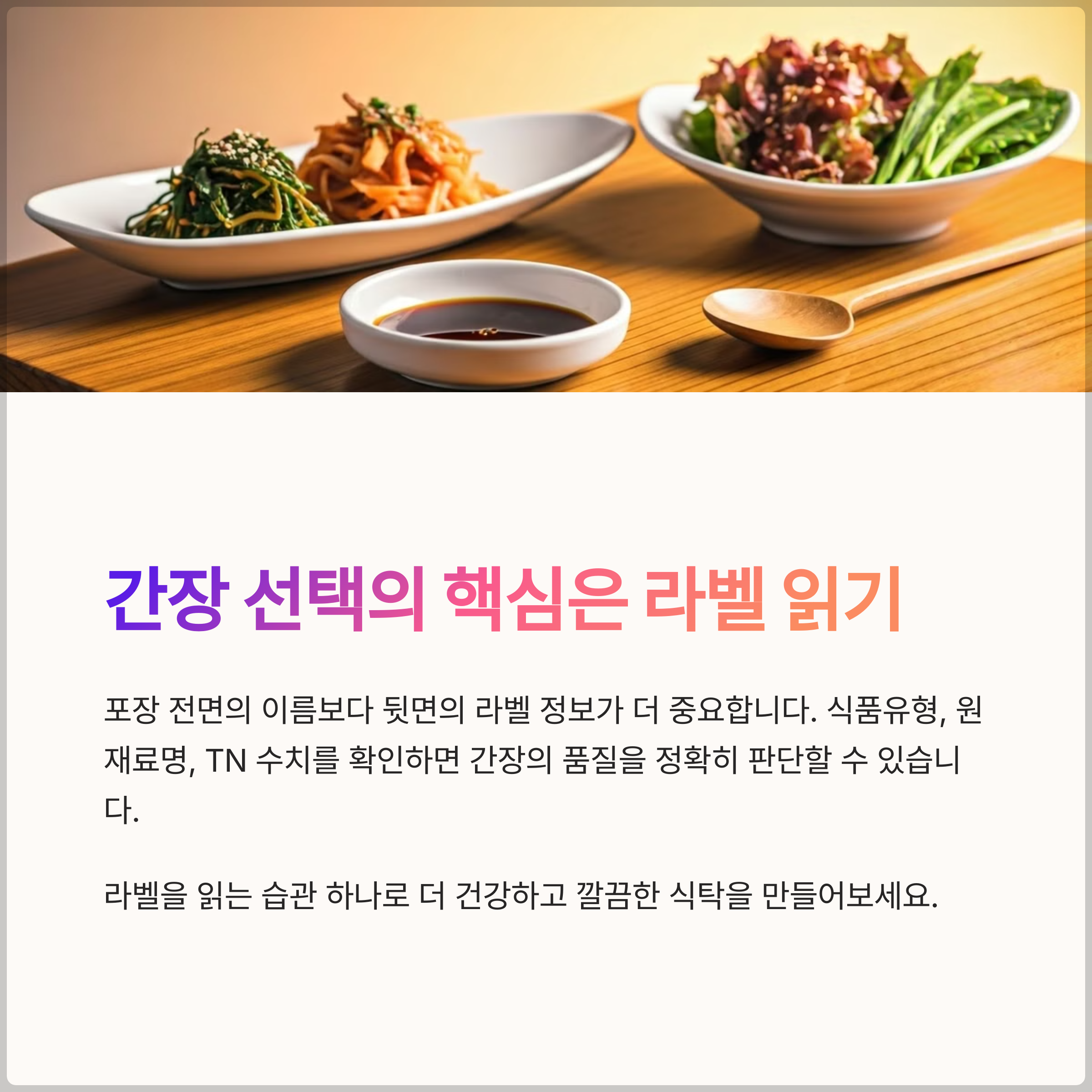 간장을 고를 때, 포장 전면의 이름보다 뒷면의 라벨 정보가 더 중요합니다. '식품유형'을 통해 제조 방식, '원재료명'으로 성분 비율, 'TN 수치'로 품질을 확인할 수 있습니다. 라벨을 읽는 습관 하나만으로도 더 건강하고 깔끔한 식탁을 만들 수 있습니다.