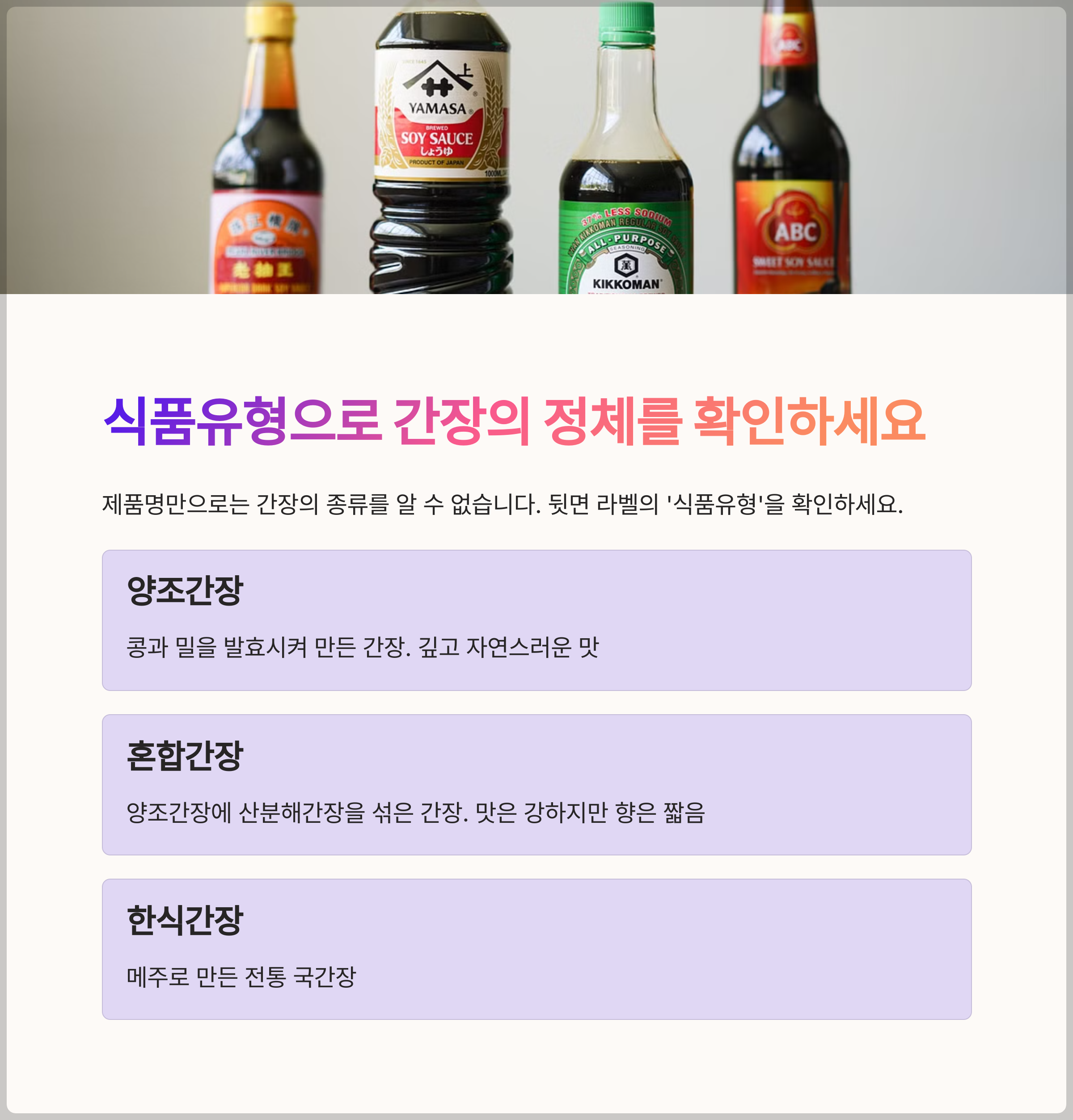 진간장, 양조간장, 국간장… 겉포장만 보고 고르셨다면, 이젠 뒷면 라벨로 정확히 구별해 보세요.
