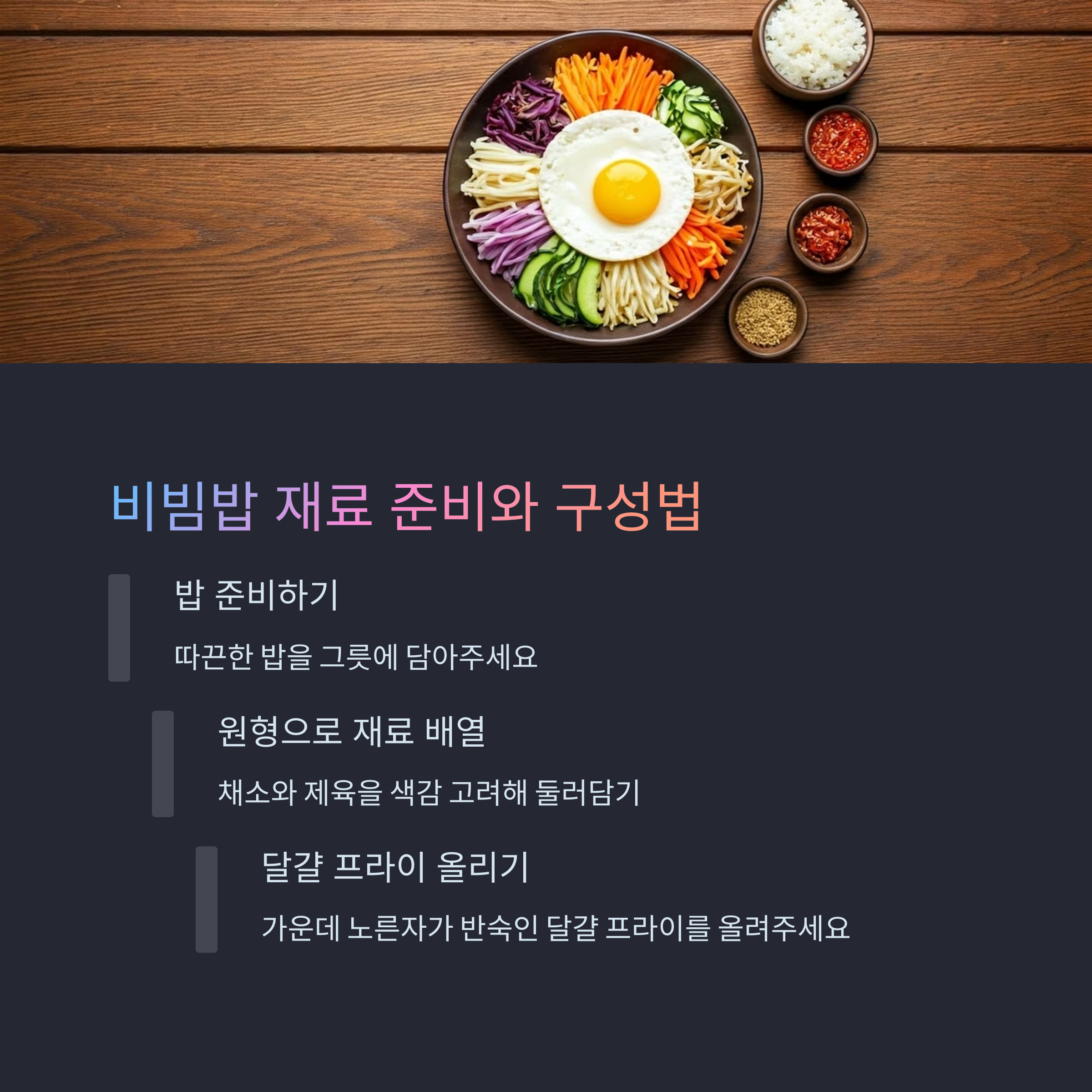 비빔밥은 플레이팅만 잘해도 훨씬 더 맛있게 느껴지는 요리입니다. 밥 위에 다양한 재료를 색상별로 나눠서 올리고 중앙에 제육과 달걀을 배치하면 비주얼이 한층 살아납니다. 초록색 채소(상추, 시금치), 주황색(당근), 흰색(숙주, 무나물), 보라색(적양배추) 등을 활용하면 더욱 다채롭고 식욕을 자극하는 그릇이 완성되죠. 나무나 흙색 그릇에 담으면 한식 특유의 따뜻한 분위기를 낼 수 있고, 블랙 컬러의 접시는 색상이 더 돋보여 세련된 느낌을 줍니다. 마지막으로 깨소금 한 꼬집과 참기름 한 방울, 그리고 김가루까지 더하면 누구나 반할 수밖에 없는 완성도 높은 한 끼 비주얼이 완성됩니다.