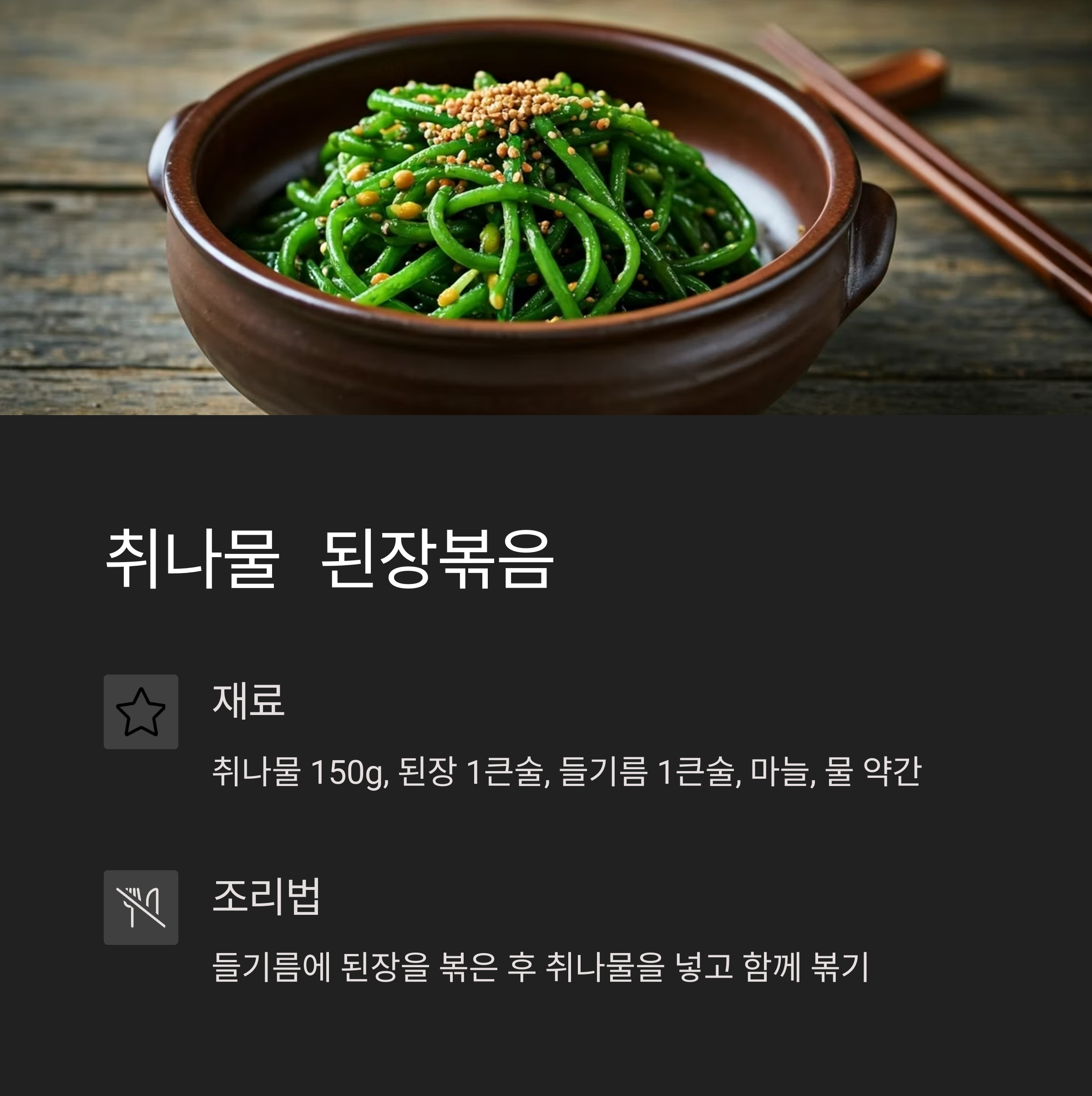 구수한 된장은 나물 반찬과 만나면서 건강한 밥상의 중심이 됩니다. 된장은 맛뿐 아니라 나물의 특성을 보완해 주는 조미료로, 조리법과 재료에 따라 선택만 잘해도 훨씬 풍성한 반찬을 만들 수 있어요. 제철 나물과 된장을 다양하게 조합해 보며 나만의 밥상 궁합을 찾아보세요!