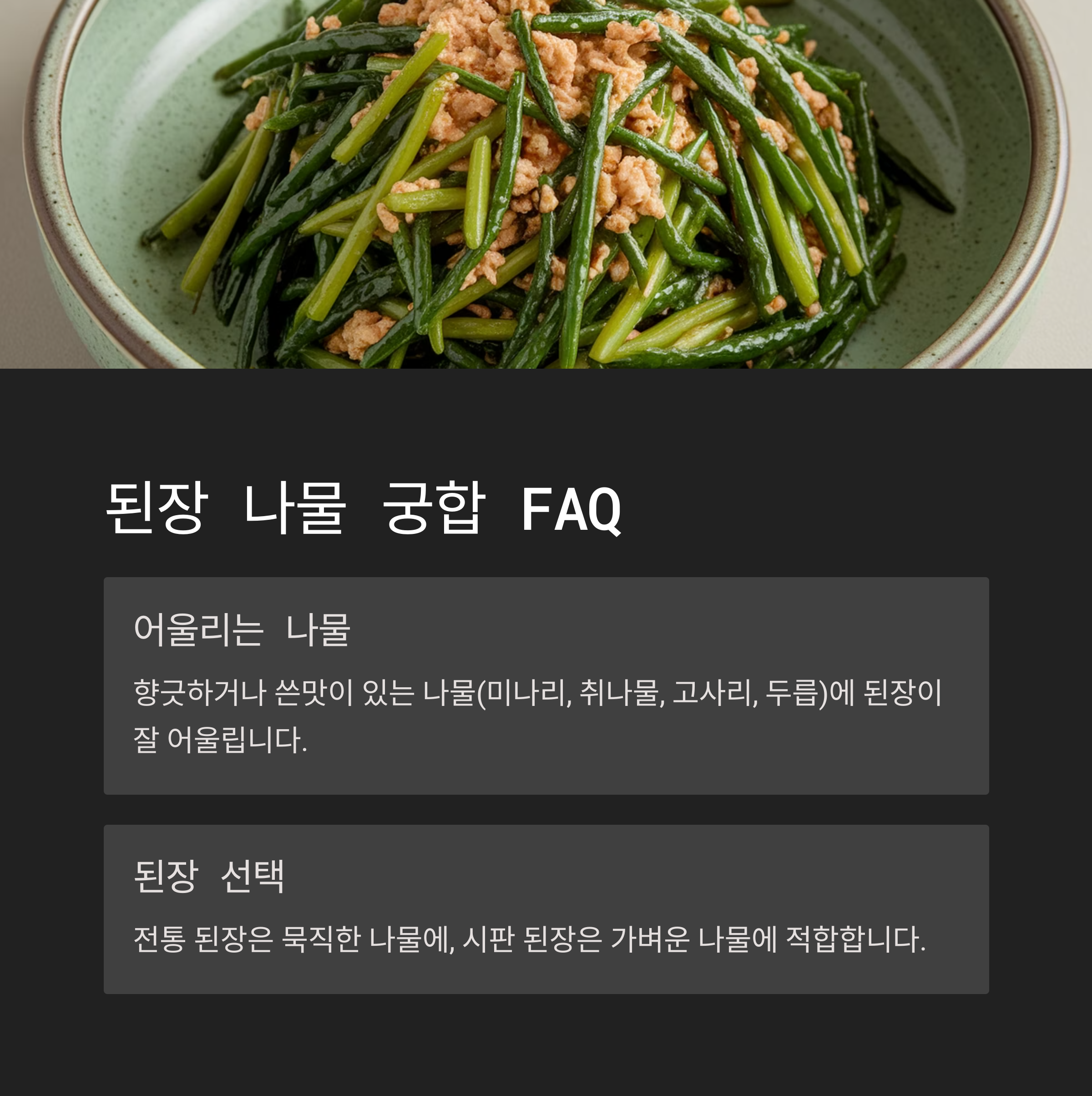 된장은 향이 강하고 구수한 풍미가 있어, 향긋하거나 쓴맛이 있는 나물과 잘 어울립니다. 미나리, 취나물, 고사리, 두릅 등 향이 뚜렷한 나물에는 된장이 훌륭한 밸런스를 줍니다. 그러나 단맛이 많은 채소나 물이 많이 생기는 나물에는 간장이나 고추장 쪽이 더 잘 맞을 수 있어요.