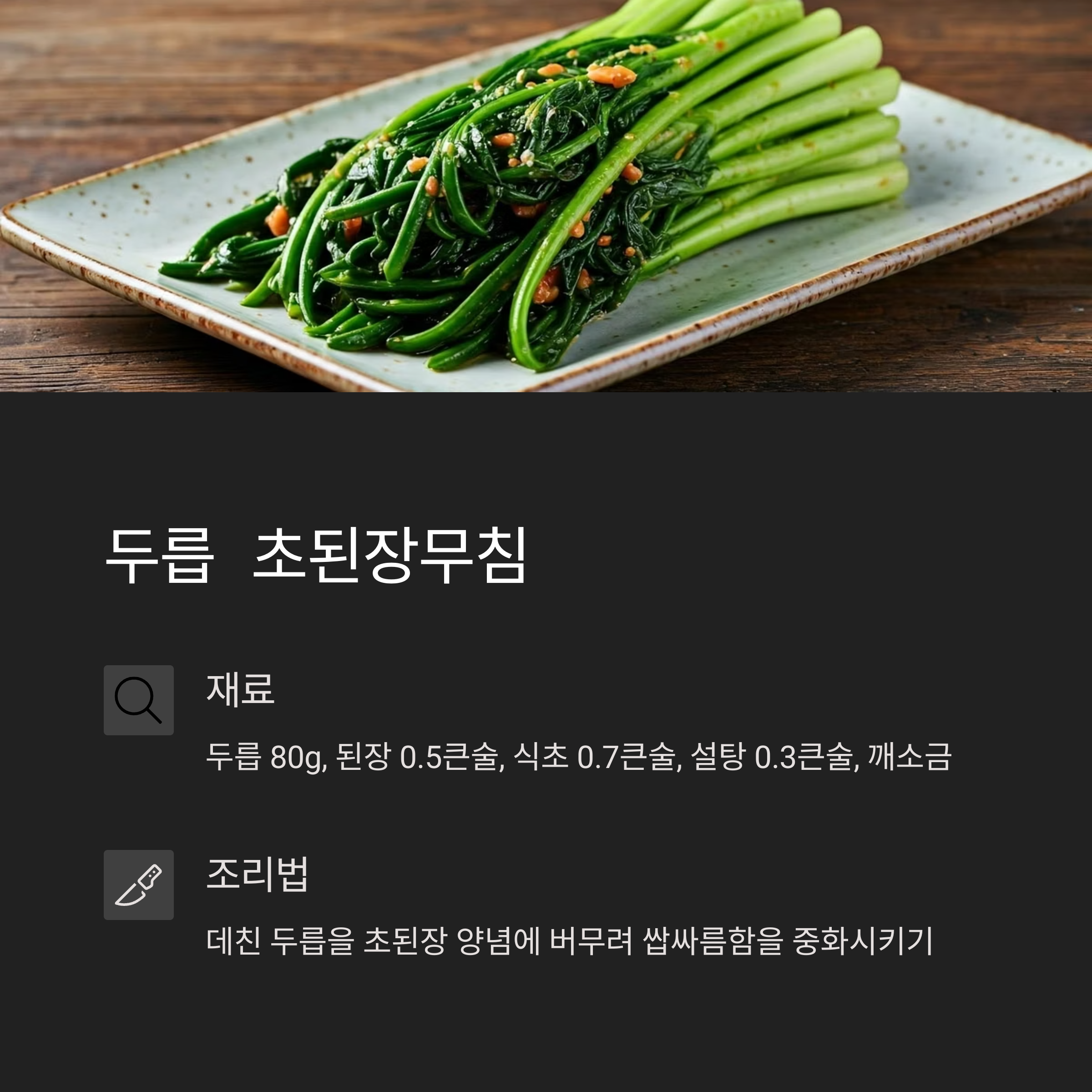 한국 전통 식탁에서 나물 반찬은 빠질 수 없는 기본 메뉴입니다. 특히 구수한 된장과 함께 무치거나 볶으면 나물 고유의 맛을 살리면서도 소화에 도움을 주고 건강한 풍미를 더해줍니다. 이 글에서는 봄과 여름 제철 채소 중 된장과 찰떡궁합을 이루는 나물을 중심으로 5가지 반찬 조합을 소개합니다.