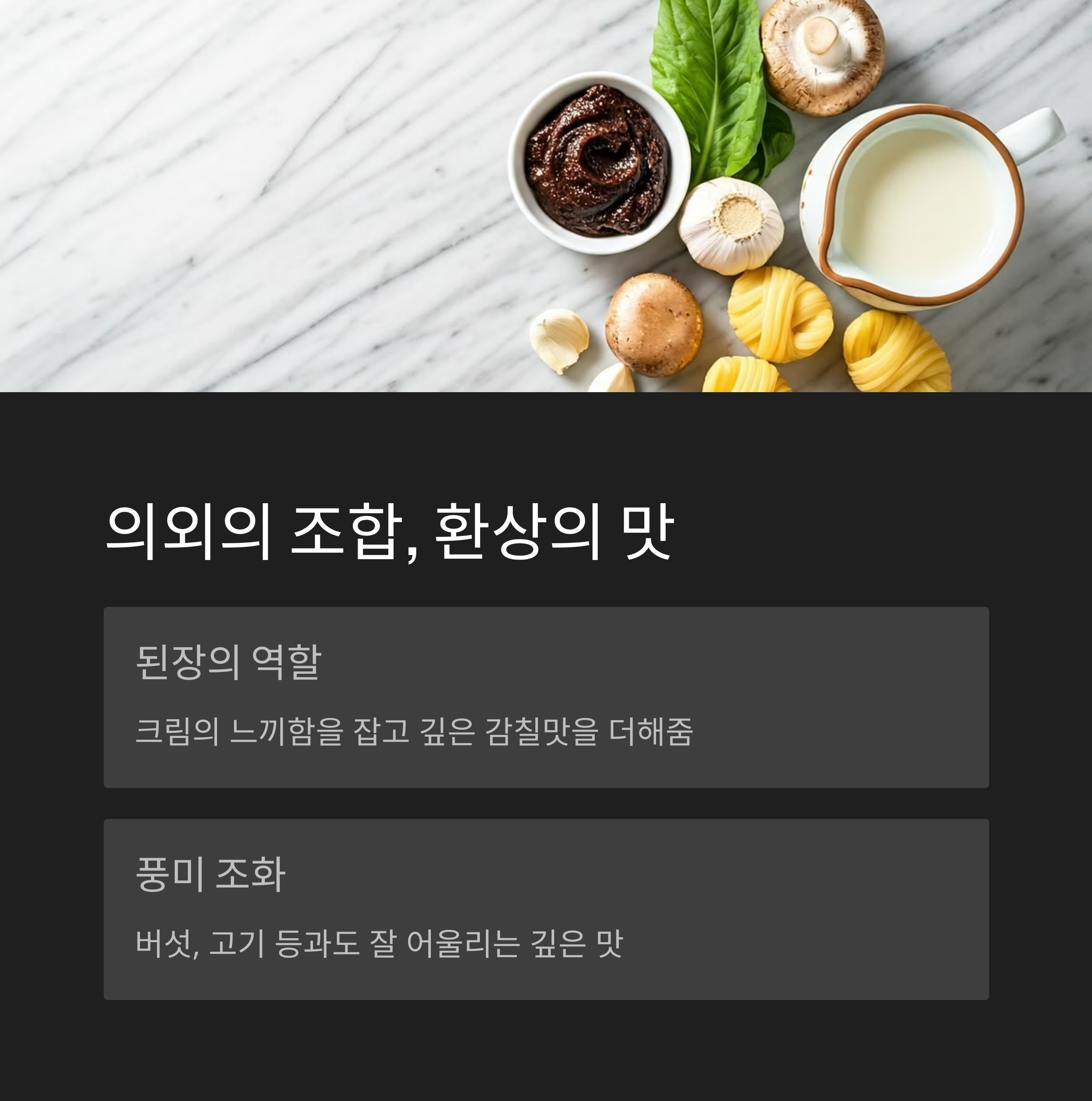 된장과 크림은 얼핏 보면 어울리지 않을 것 같지만, 실제로는 놀라운 시너지를 자랑합니다. 크림의 부드럽고 진한 맛이 된장의 구수함과 만나면, 마치 된장국에 우유를 살짝 탄 듯한 독특하면서도 친숙한 풍미가 완성됩니다. 특히 발효된 된장이 가진 감칠맛은 크림이 부족한 풍미를 보완해주며, 단맛이 강하지 않은 크림소스에 은은한 짠맛과 깊이를 더해줍니다. 이 조합은 버섯, 닭고기, 해산물 등 어떤 재료와도 잘 어우러지며, 식사 후 입안에 남는 잔향과 여운까지 고려한 조리법이라 할 수 있습니다. 진한 맛을 좋아하는 분이라면 파마산 치즈를 살짝 추가하면 더욱 깊은 맛의 완성을 경험할 수 있습니다.