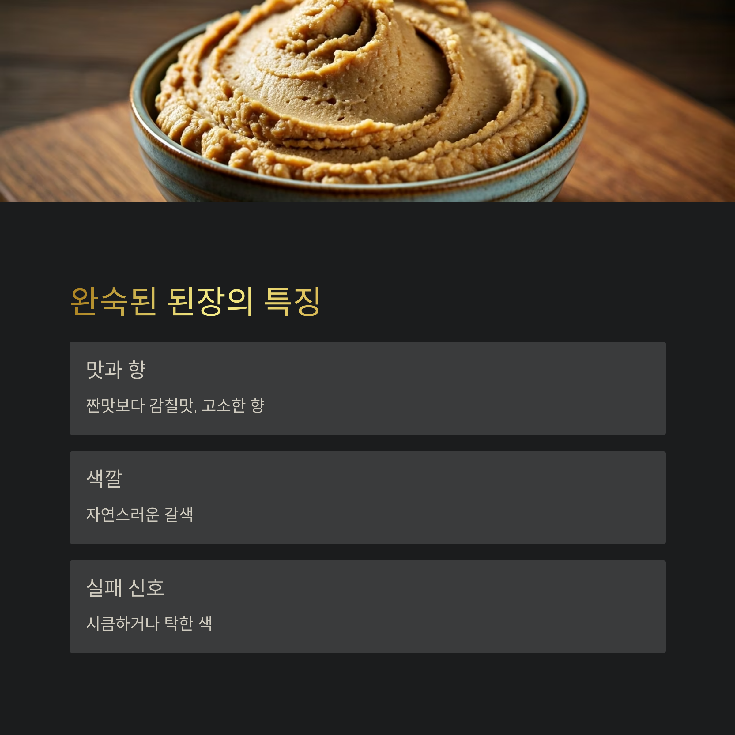 반면 숙성이 덜 됐거나 환경이 나빴던 된장은 색이 탁하거나 푸르스름하고, 시큼하거나 쓴맛이 날 수 있으며, 표면에 이물 곰팡이가 자주 발생하는 특징도 있습니다.