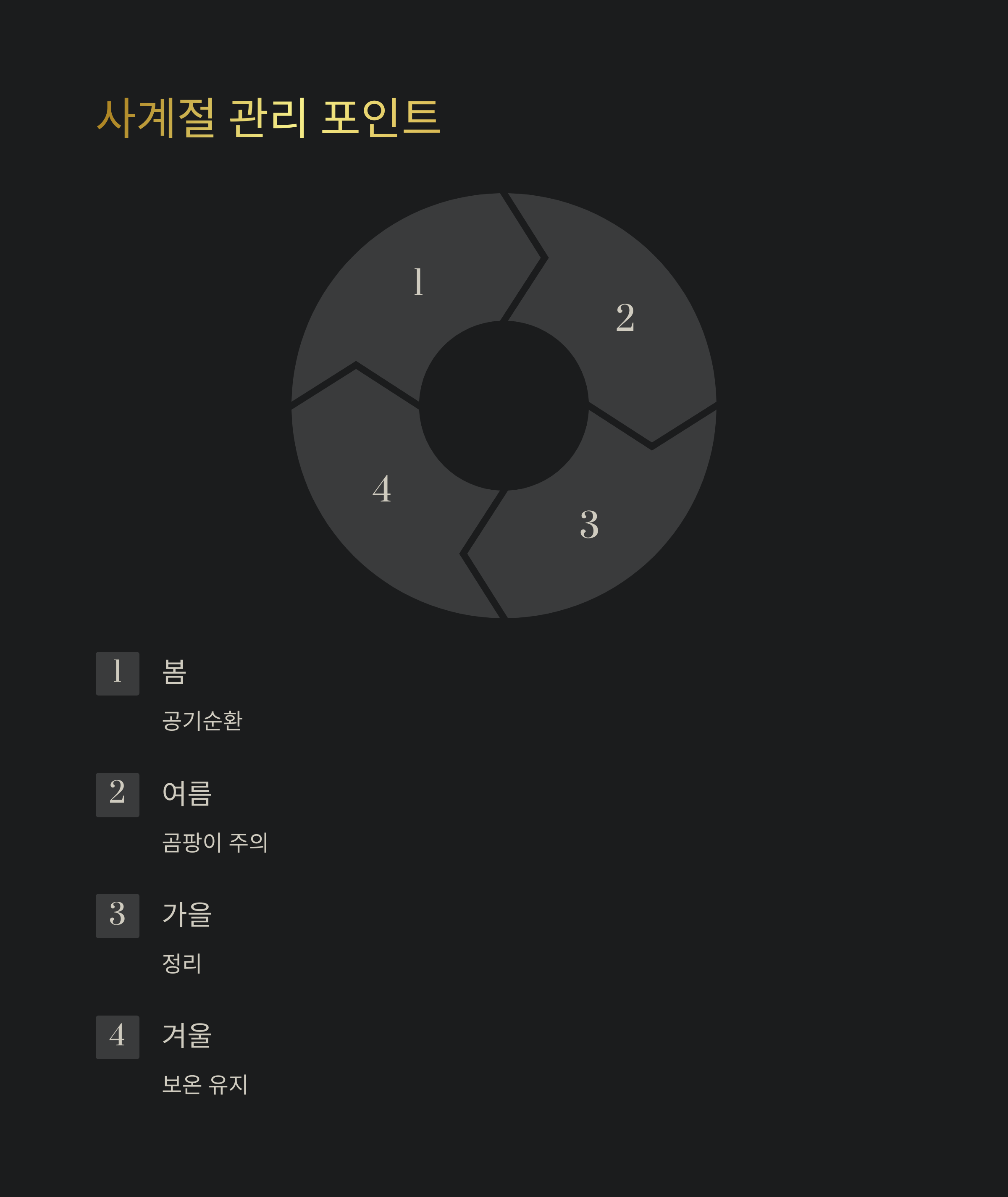 특히 여름철 고온다습한 환경은 잡균 번식에 유리한 조건이므로 그늘진 외기 순환이 잘 되는 곳에서 보관하거나, 햇볕에 자주 열고 닫아 공기순환을 통해 열과 수분을 배출해줘야 합니다.