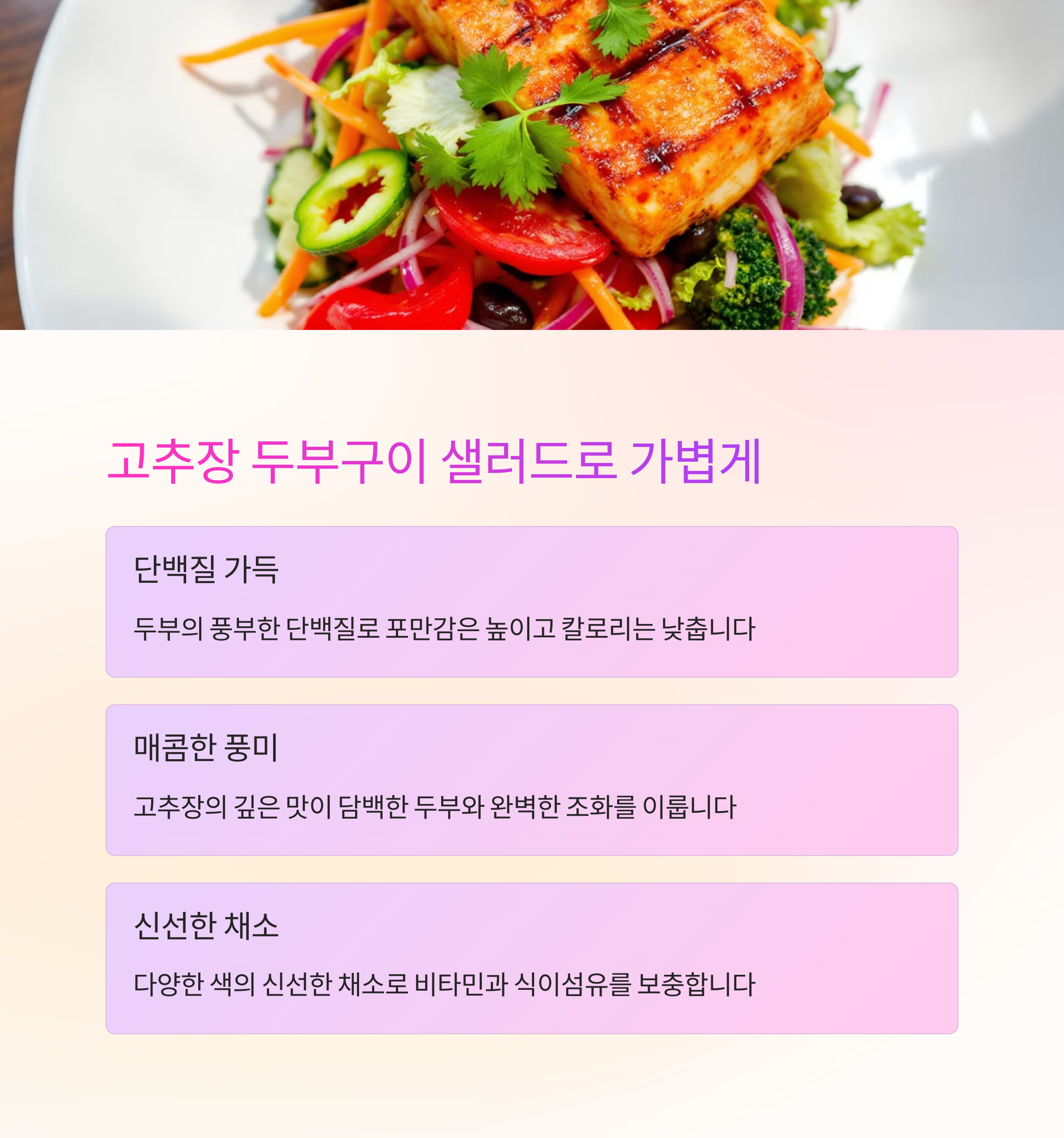 조리법: 1) 두부를 적당한 크기로 썰어 팬에 올리브유를 두르고 노릇하게 굽습니다. 2) 고추장과 간장을 섞어 양념장을 만듭니다. 3) 상추, 오이, 방울토마토를 곁들여 샐러드를 만든 후 양념장을 뿌립니다.