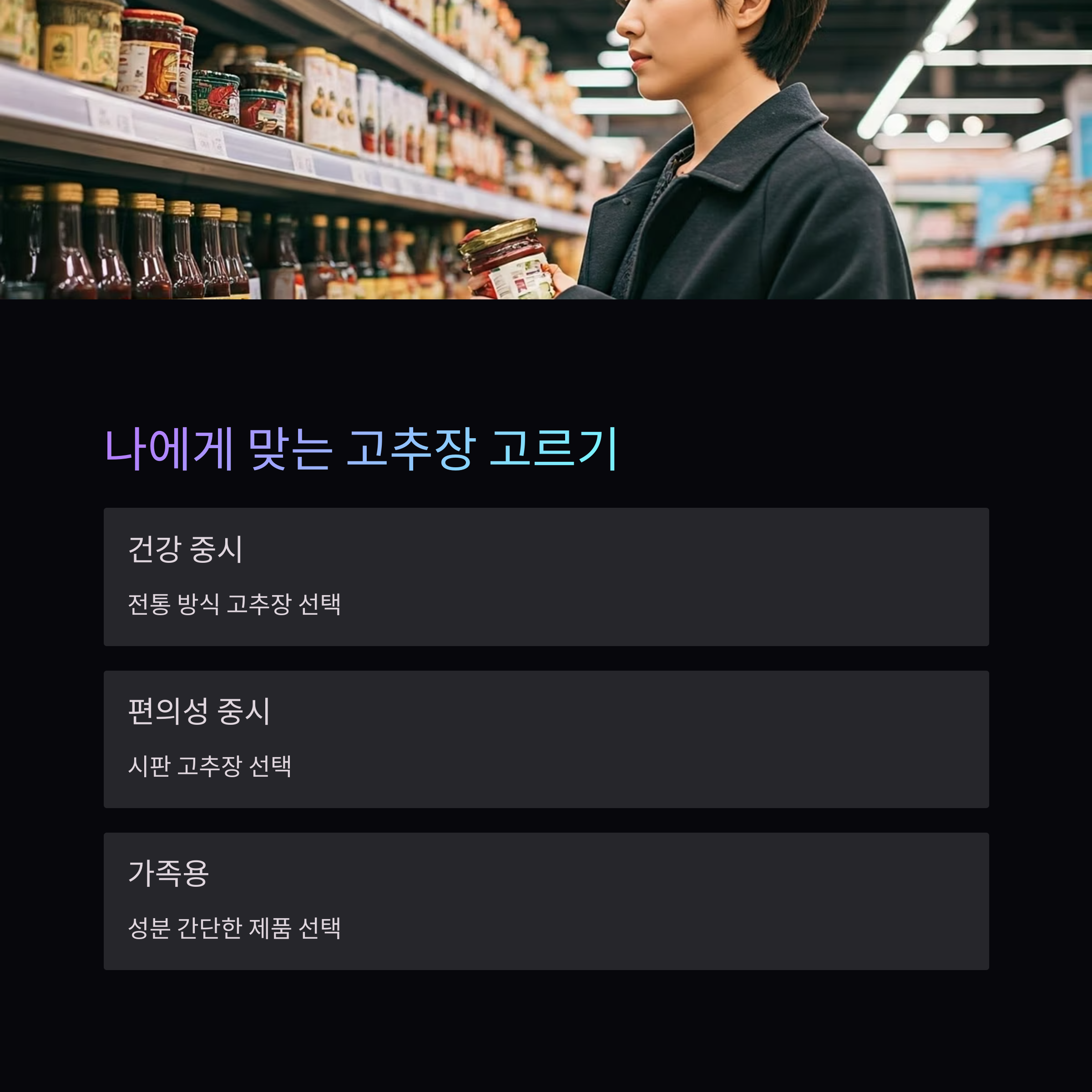 고추장을 선택할 때는 자신의 식습관과 요리 스타일을 고려하는 것이 좋습니다. 예를 들어 자극적인 맛보다는 건강한 식단을 지향하는 분이라면 전통 고추장을 추천합니다. 반면 간편하게 요리하고 짧은 조리 시간 내에 맛을 내고 싶은 분이라면 시판 고추장도 나쁘지 않은 선택입니다. 또한, 단맛을 싫어하는 경우라면 액상과당 함량이 적은 제품을 선택하는 것이 중요합니다. 어린이나 가족이 함께 먹는다면 성분이 단순하고 첨가물이 적은 제품을 고르는 것이 더욱 안전합니다. 요리용으로 사용할 땐 용도에 맞게 '비빔용', '조림용'으로 나뉘는 제품도 있으니 라벨을 꼭 확인하세요.