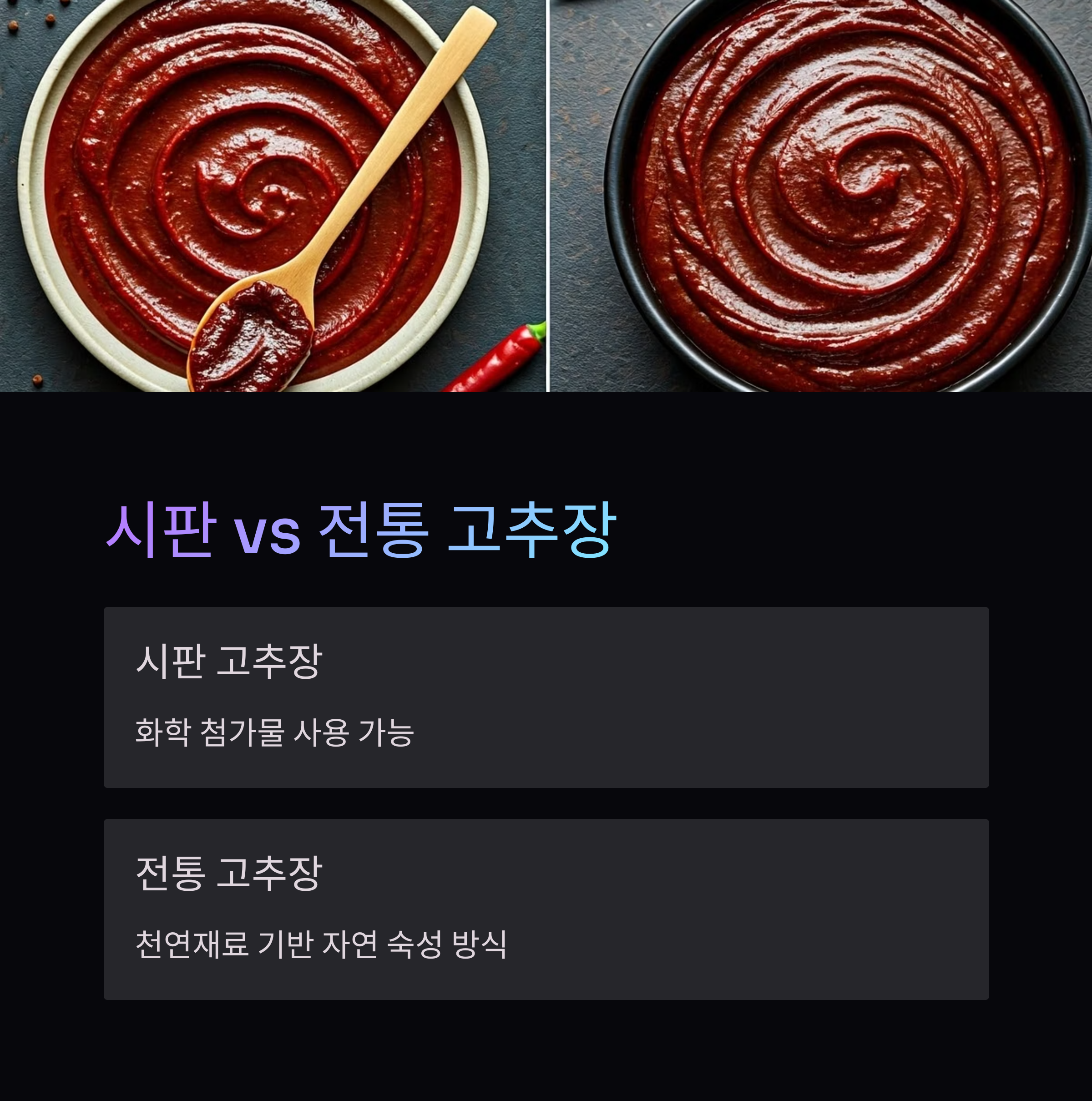 A. 시판 고추장은 대량 생산을 위한 공정 중심, 전통 고추장은 장시간 자연 발효와 순수 재료 사용이 핵심입니다.