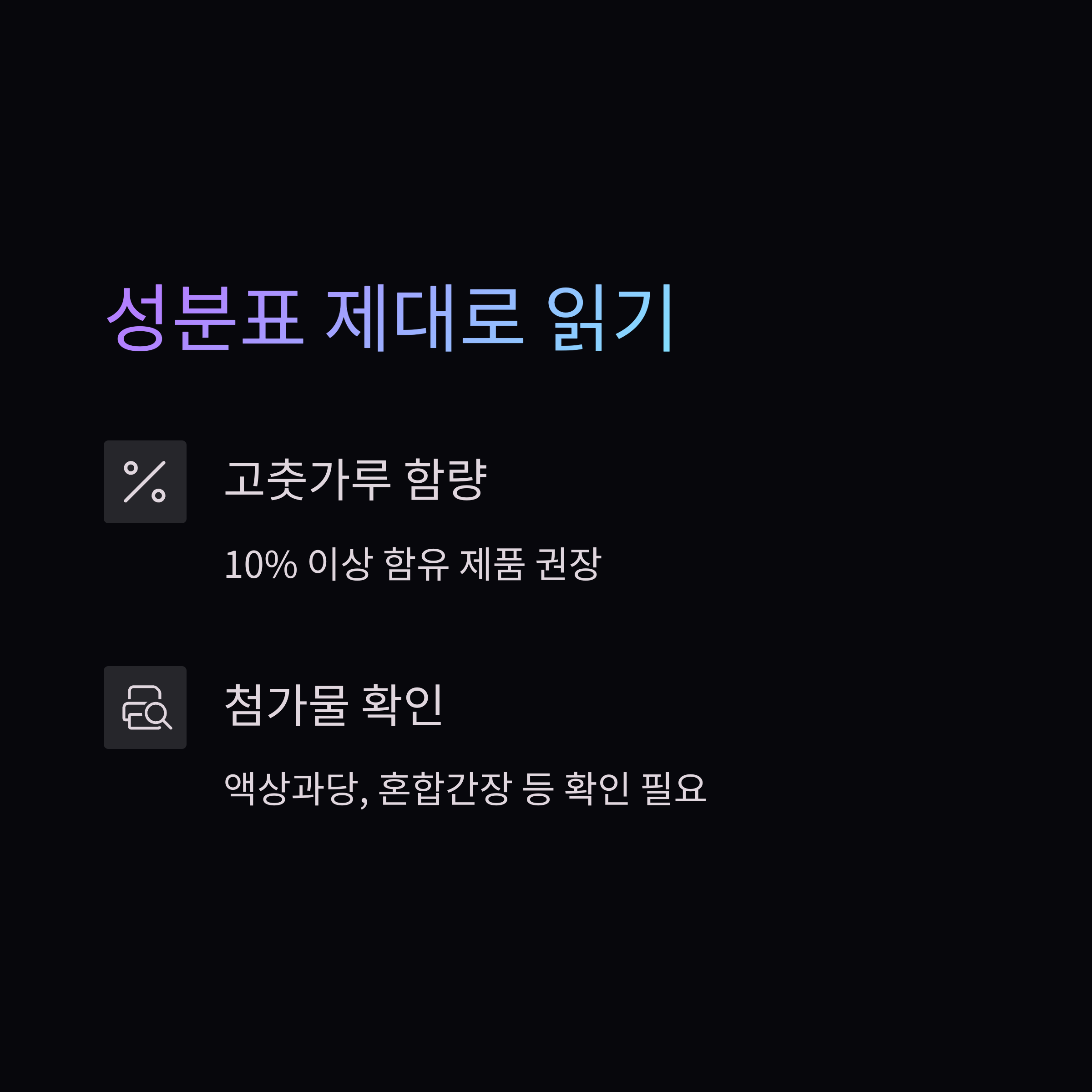 A. 고춧가루 함량, 첨가물 유무, 용도별 구분 여부 등 성분표 확인이 가장 중요합니다.
