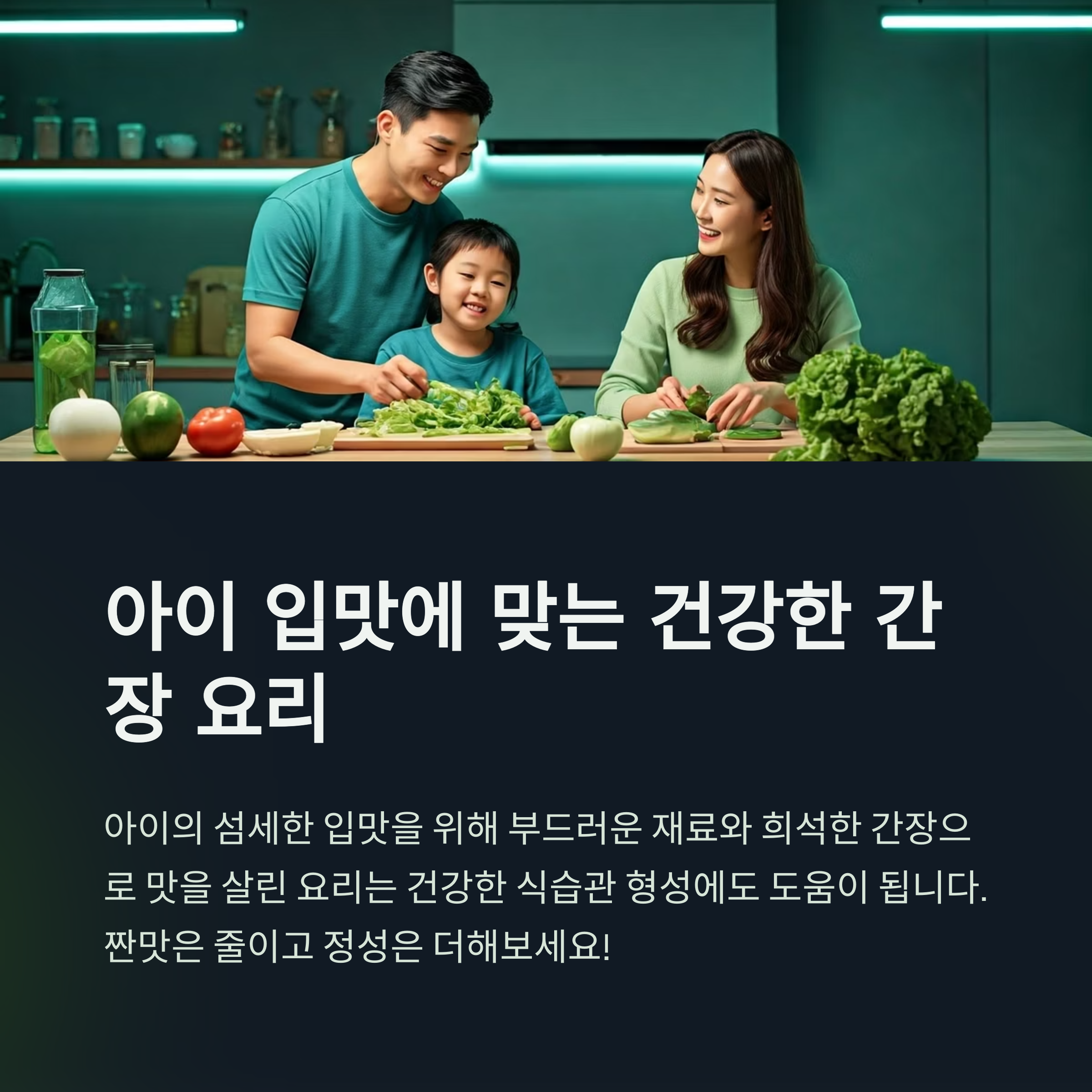 아이의 입맛은 아주 예민하고 섬세합니다. 자극적인 양념보다 부드러운 재료, 희석한 간장으로 맛을 살린 요리는 식습관 형성에도 긍정적인 영향을 줄 수 있어요. 짠맛은 줄이고, 정성은 더해 건강한 간장 요리를 함께 만들어보세요.