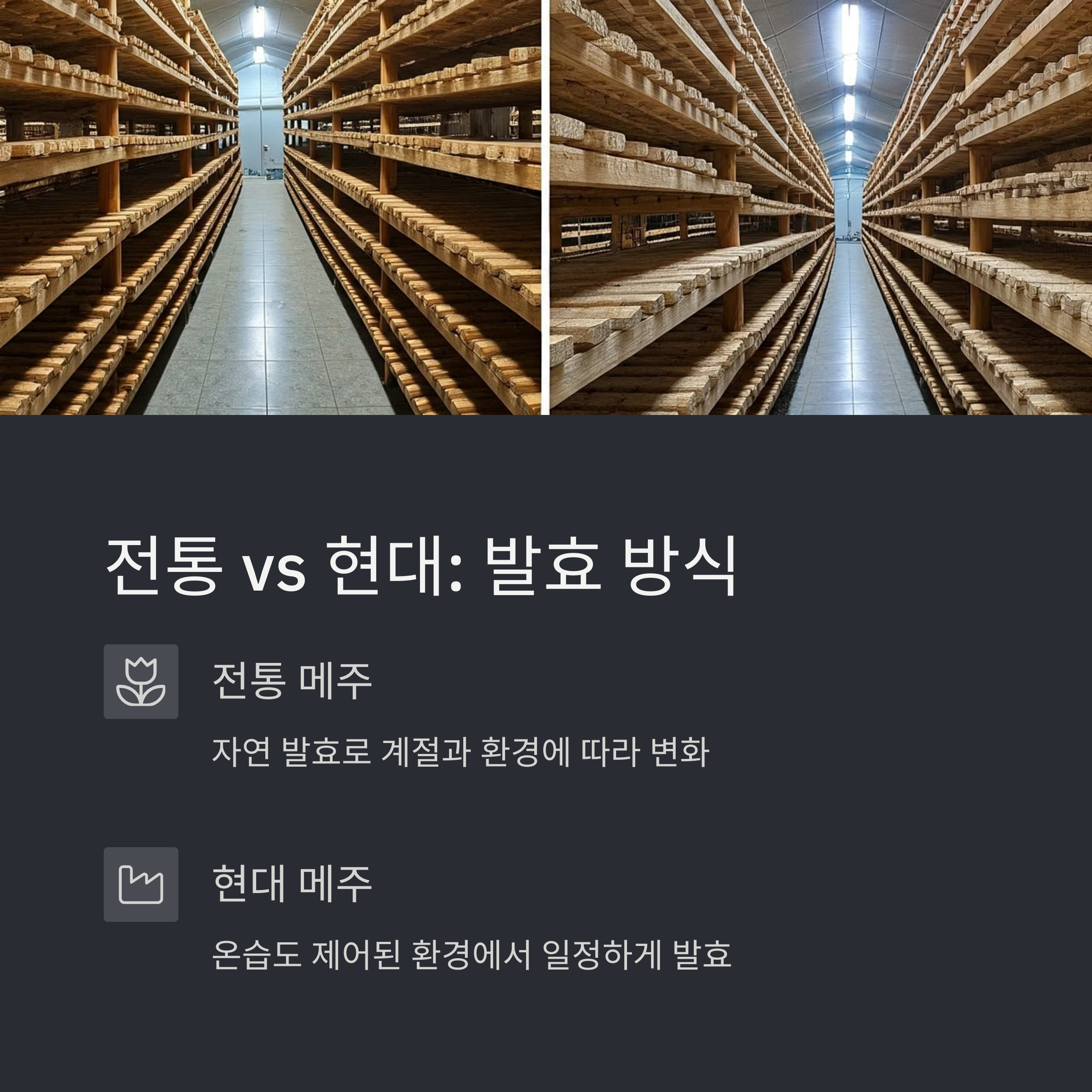 즉, 전통 메주는 깊은 맛과 자연스러움, 현대 메주는 안정성과 대중성이 강점입니다.