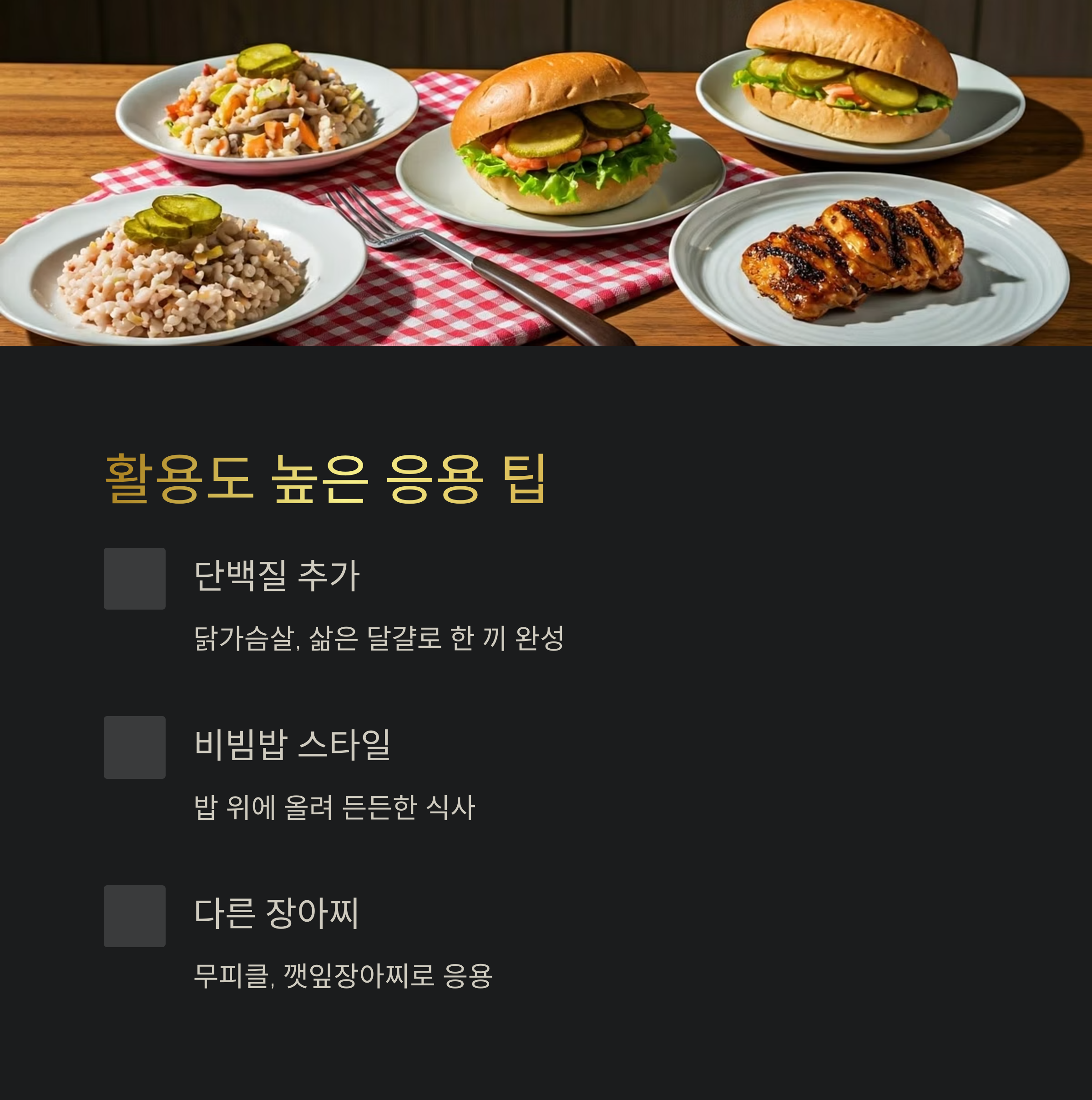 - 곁들이기: 닭가슴살, 삶은 달걀, 훈제 오리 등 단백질을 더하면 한 끼 식사로 충분 - 밥 위에 올려 비빔밥처럼 즐겨도 좋고, 샌드위치 속재료로도 OK - 식초 한 방울, 레몬즙 추가 시 산뜻함 UP - 간장피클 외에도 무피클, 가지장아찌, 깻잎장아찌 응용 가능