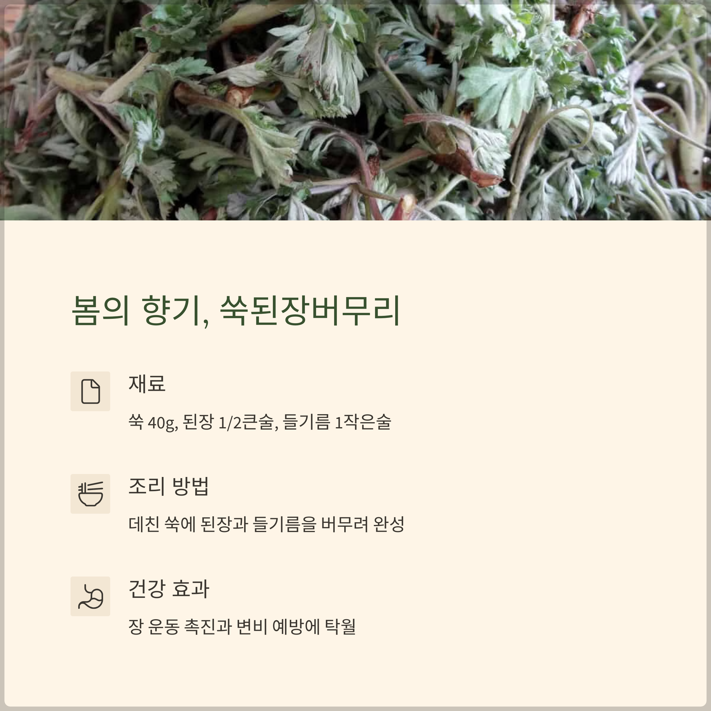 재료: 쑥 40g, 된장 1/2큰술, 들기름 1작은술