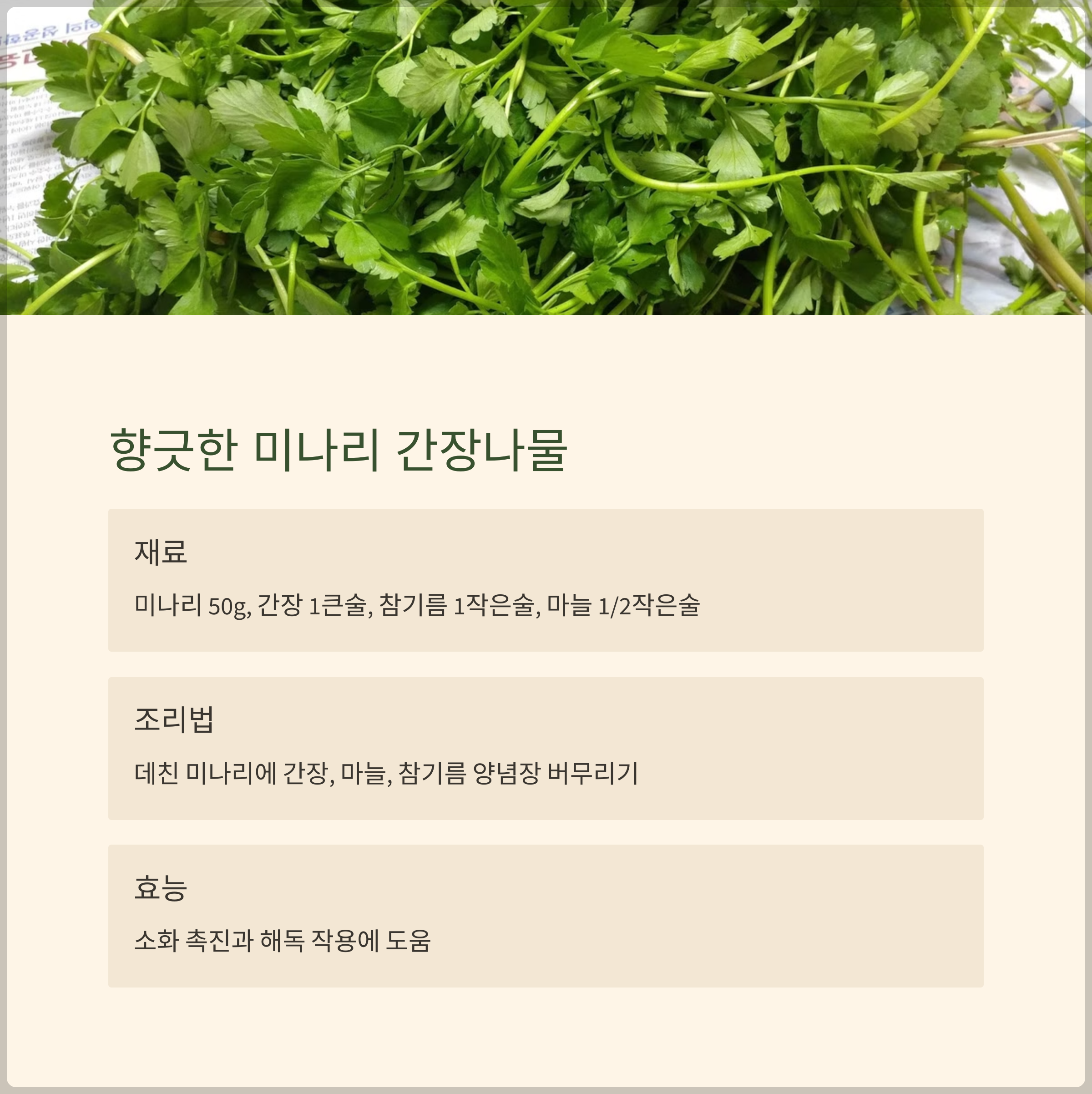 재료: 미나리 50g, 간장 1큰술, 참기름 1작은술, 다진 마늘 1/2작은술