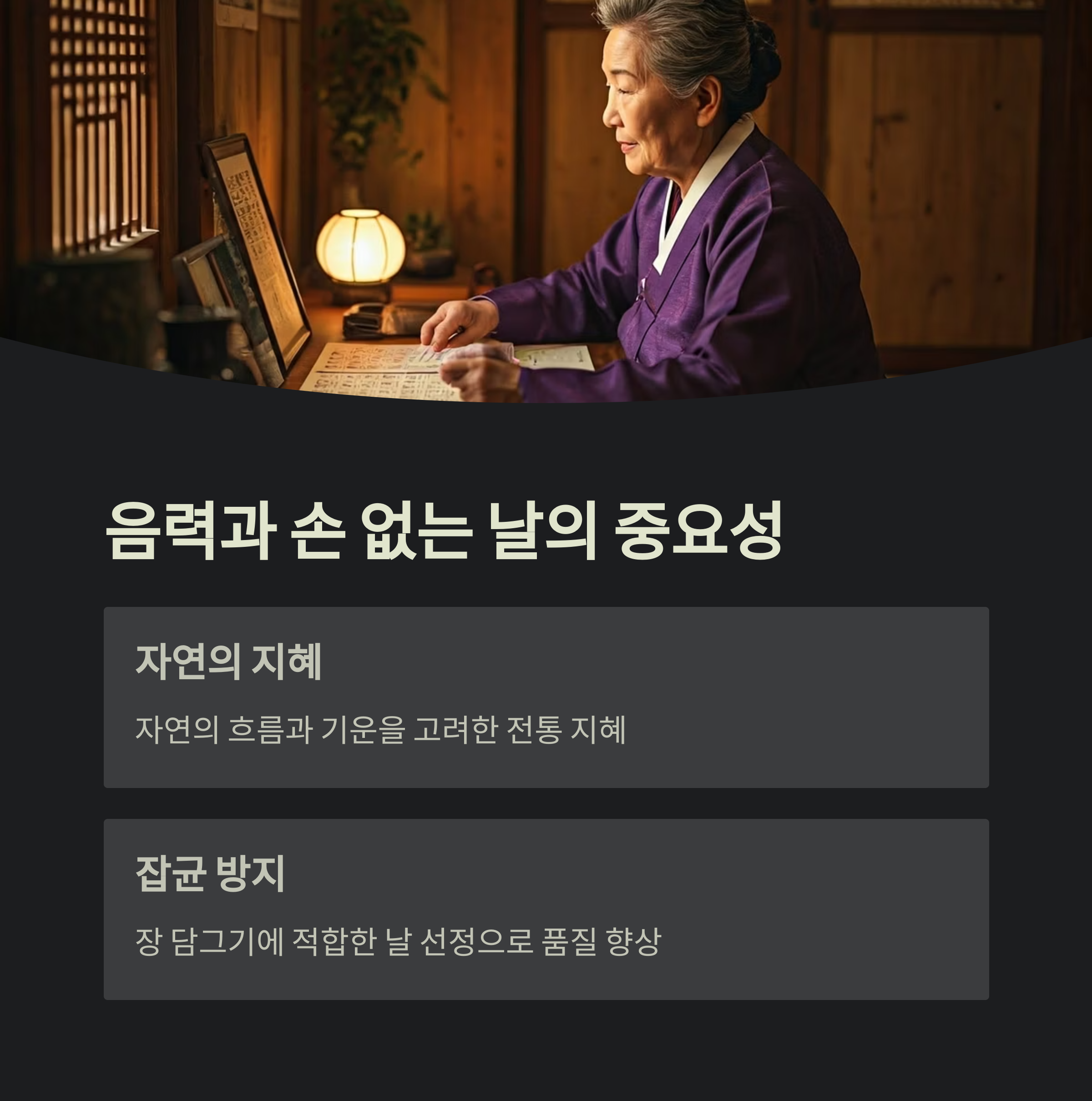 장 담그기와 관련해서 손 없는 날을 고른 이유는 단순한 미신이 아니라, **자연과 인간이 조화롭게 상생하는 날**로 여겨졌기 때문입니다. 귀신이 쉬는 날엔 외부 잡기(雜氣)나 부정한 기운이 덜 타며, 이는 발효 중인 장에도 영향을 주지 않는다는 믿음이 있었죠.