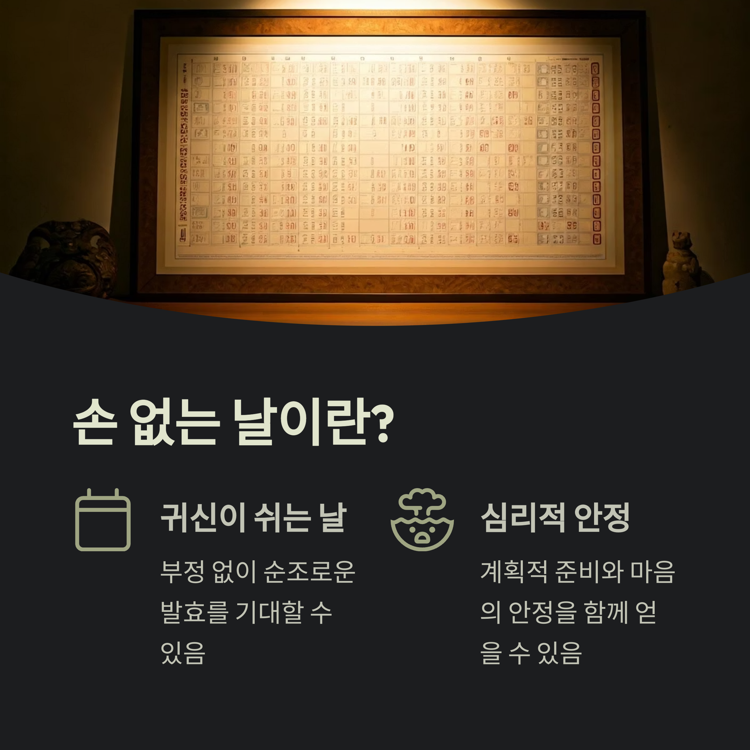 '손 없는 날'이란 전통에서 **귀신이나 재앙이 쉬는 날**로 여겨지며, 이 날에는 이사, 결혼, 개업, 그리고 장 담그기까지 중요한 일을 많이 했습니다.