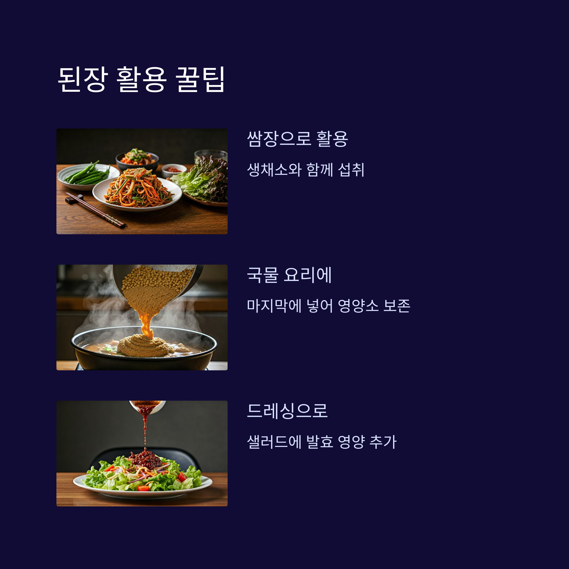 둘째, 생된장 섭취도 적극 권장됩니다. 쌈장, 드레싱, 장아찌 양념 등으로 활용하면 열에 약한 영양소도 그대로 섭취할 수 있습니다.