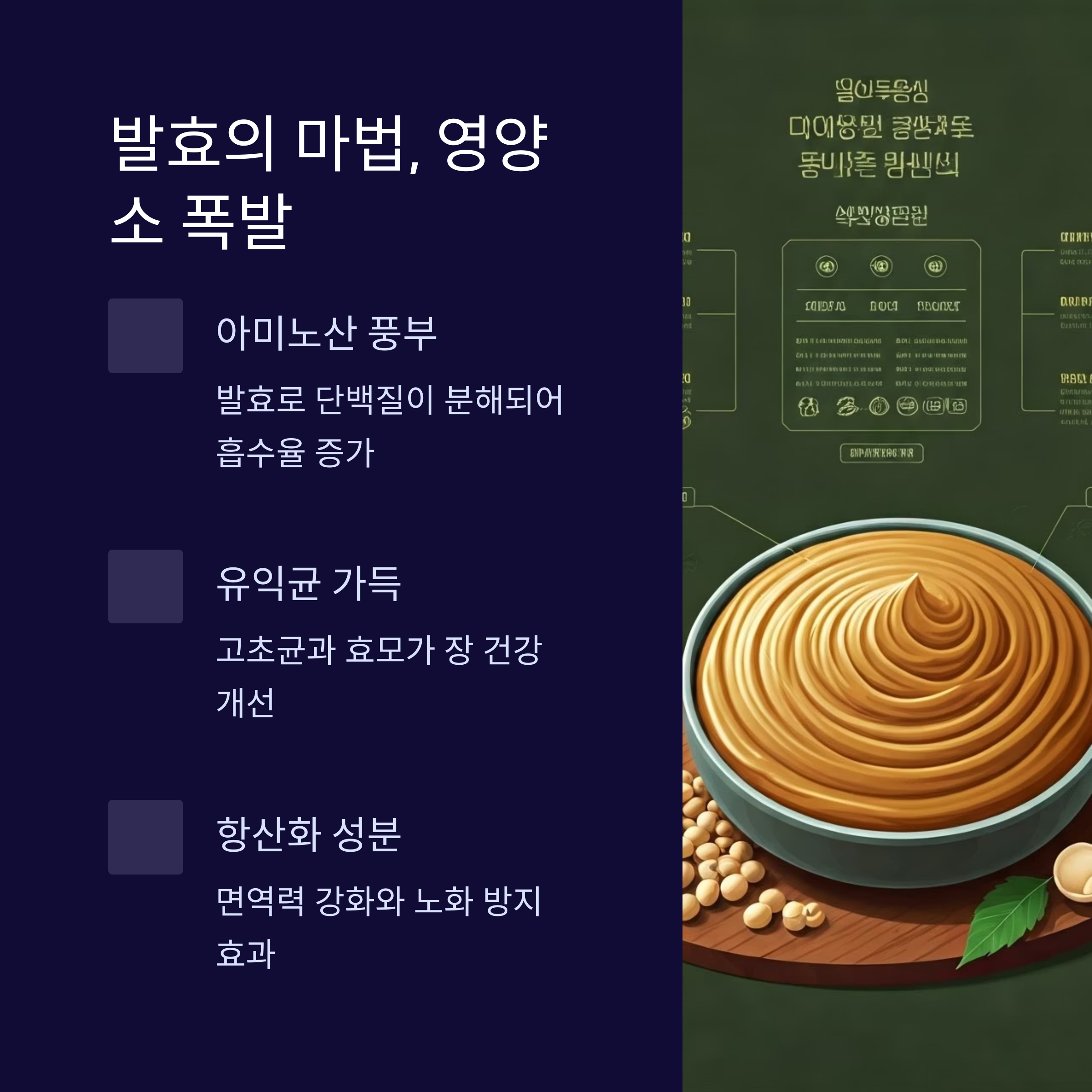 또한 비타민 B군, 폴리페놀, 식이섬유 같은 항산화 성분도 생성되어 단순한 영양소 이상의 건강 보호 효과를 제공합니다. 식품을 숙성시키면서 오히려 영양이 높아지는 대표적인 전통 식품인 셈입니다.