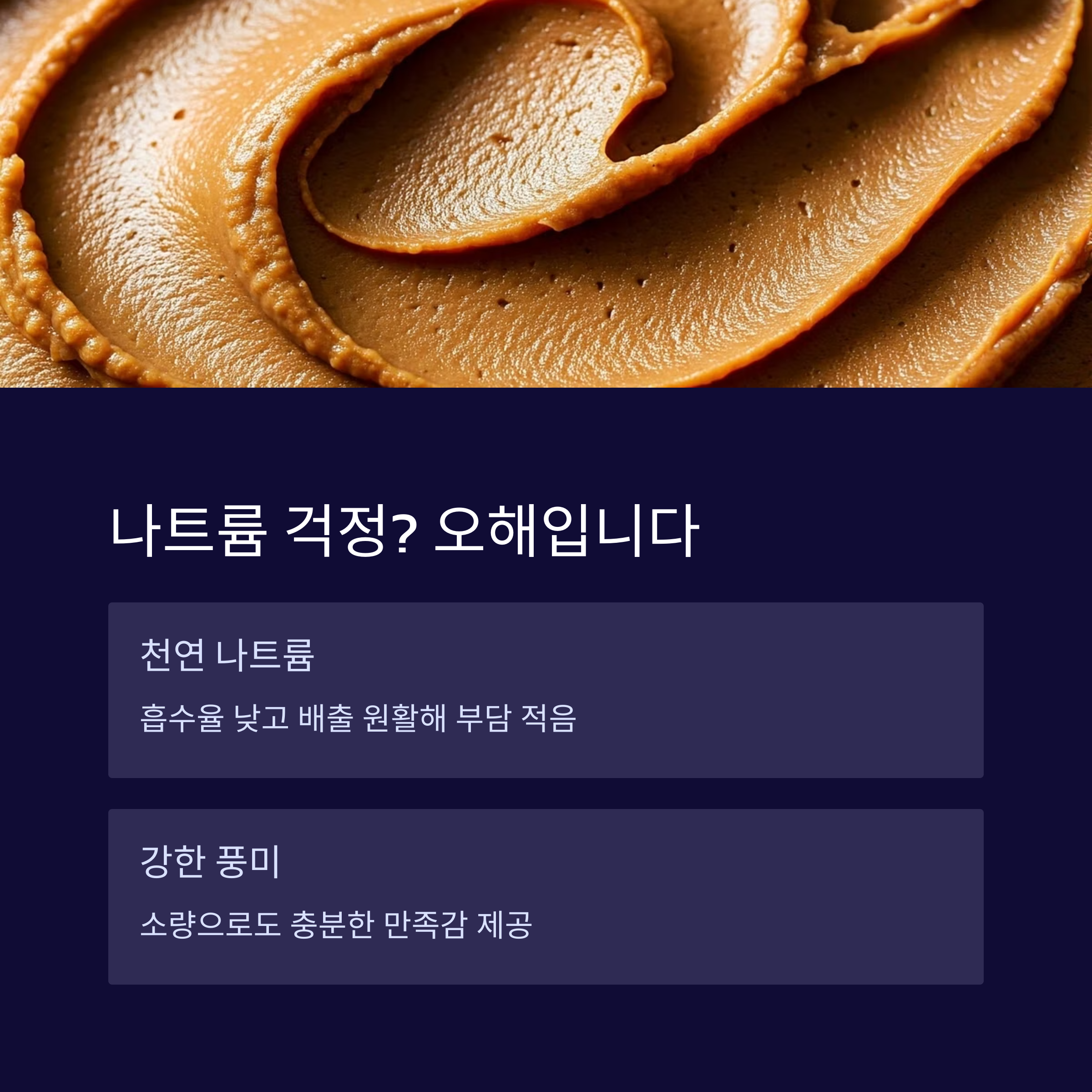 전통 된장은 염도는 높지만, 실제 나트륨이 체내에 흡수되는 방식이 다릅니다. 발효된 된장은 아미노산과 결합된 형태의 ‘천연 나트륨’이기 때문에 정제 소금에 비해 혈압 상승 효과가 적고, 체외 배출이 더 원활합니다.