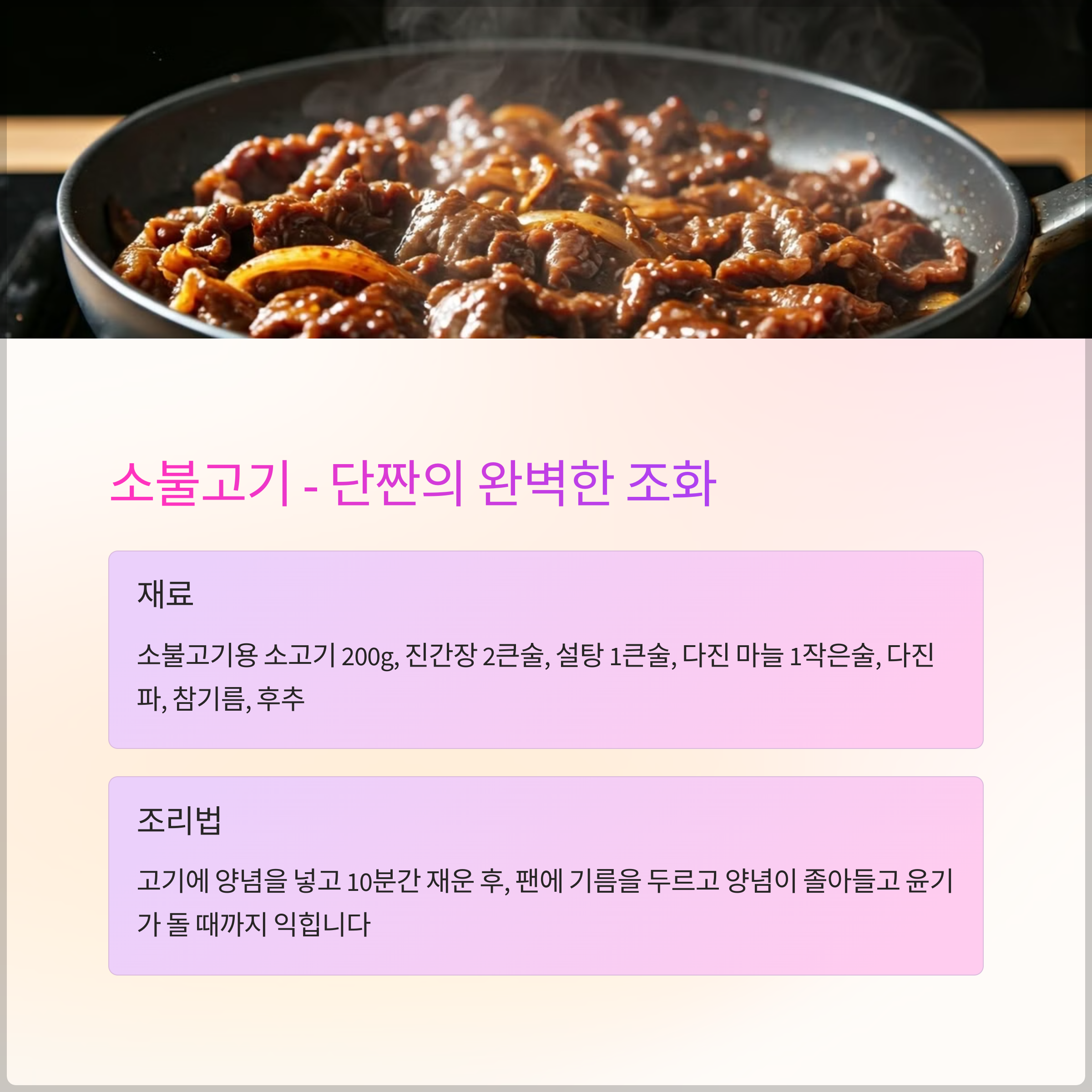 | 불고기 | 단짠 간장양념의 대표 메뉴 |