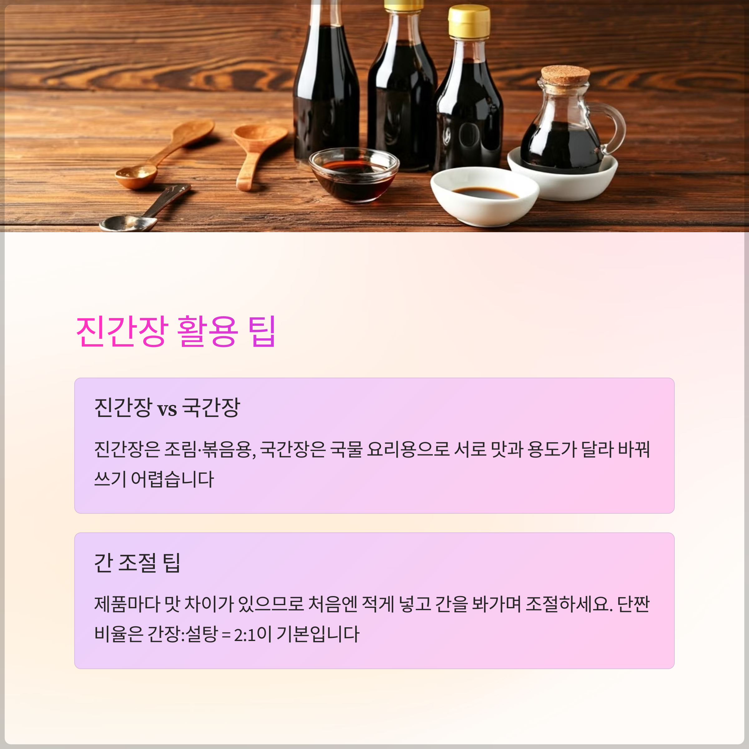진간장은 색과 단맛, 감칠맛이 강조되어 조림, 볶음, 양념장 등에 적합합니다. 반면 국간장은 색이 옅고 짠맛이 강해 국물 요리에 주로 쓰입니다. 둘은 용도가 확연히 달라서 바꿔 쓰기보다는 상황에 맞게 사용하는 것이 좋습니다.