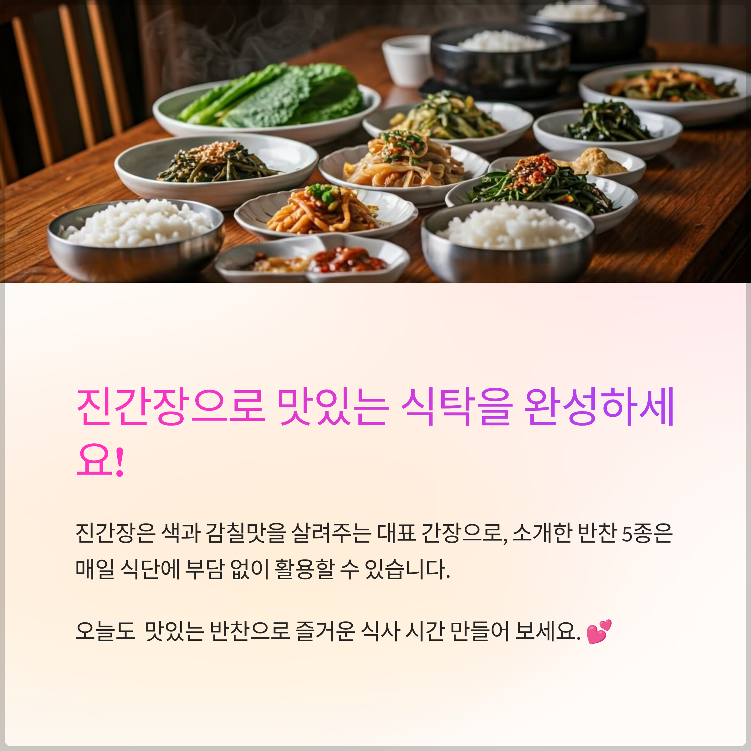 진간장은 한국식 단짠 요리에 핵심적으로 쓰이는 만능 간장입니다. 색을 잘 내고 감칠맛도 강해 조림, 볶음, 불고기 등 다양한 반찬에 활용됩니다. 오늘 소개한 5가지 기본 반찬은 진간장의 특성을 잘 살린 대표 메뉴로 매일 식탁에 활용하기 좋은 구성입니다. 진간장의 맛을 이해하고 조리법에 응용하면, 밥상 위 반찬의 깊이도 함께 달라질 거예요.